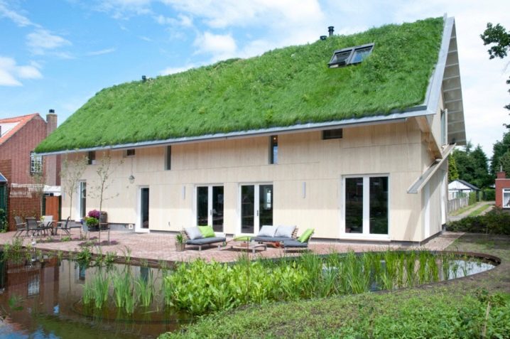 Zum Beispiel, Anhänger von umweltfreundlichen Materialien, die keine Angst haben, zu experimentieren, können Sie das sogenannte Contrail-Dach anbieten, wenn anstelle von Fliesen oder Schiefer Rasen Gras oder Blumen verwendet wird - so ist der ungewöhnliche grüne Teppich auf dem Dach.