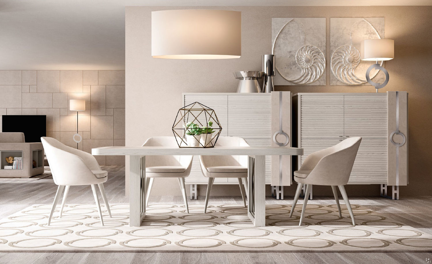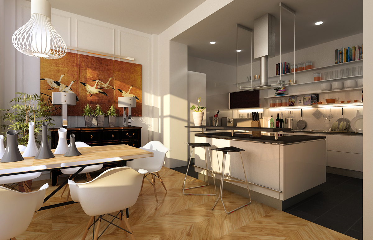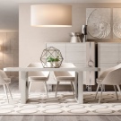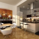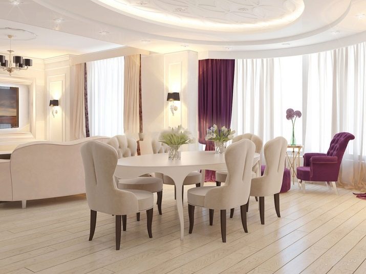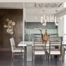 Meistens haben Speisesäle in Privathäusern eine weiße Standarddecke mit Lampen aus verchromtem oder schwarzem Metall (Schienensysteme sind ideal). Auf dem Boden können Sie ein Laminat oder eine Fliese jeden Farbtons verlegen, am beliebtesten sind jedoch Creme, Beige, Soft Grey und Milchprodukte. Helle Möbel mit Metall- und verchromten Details sowie transparente Glas-Arbeitsplatten wirken vor allem organisch gegen ihren Hintergrund.