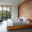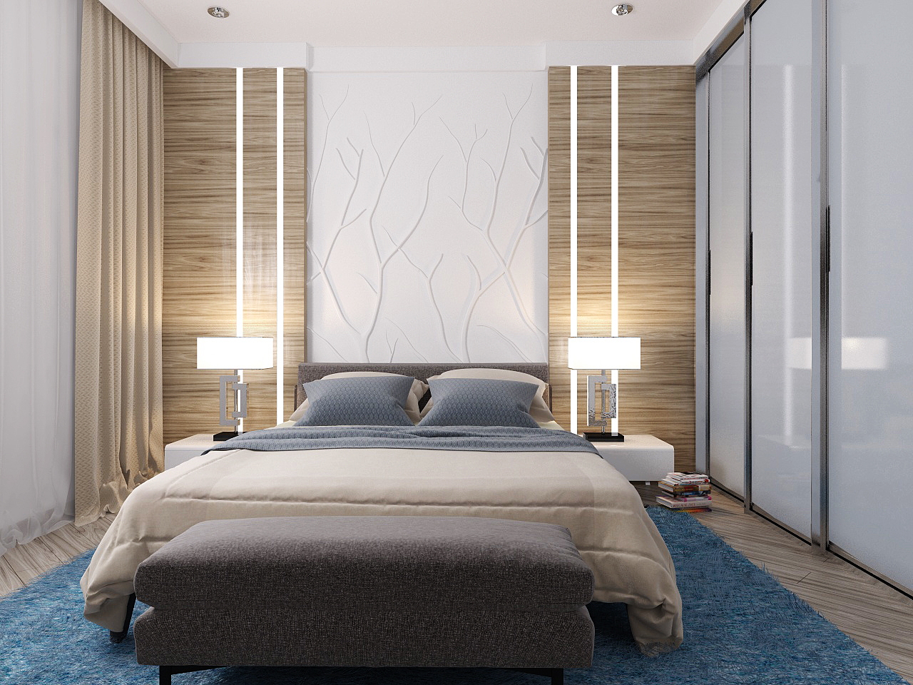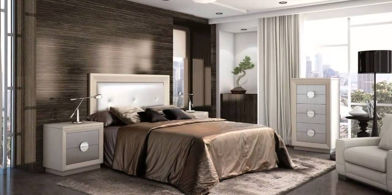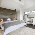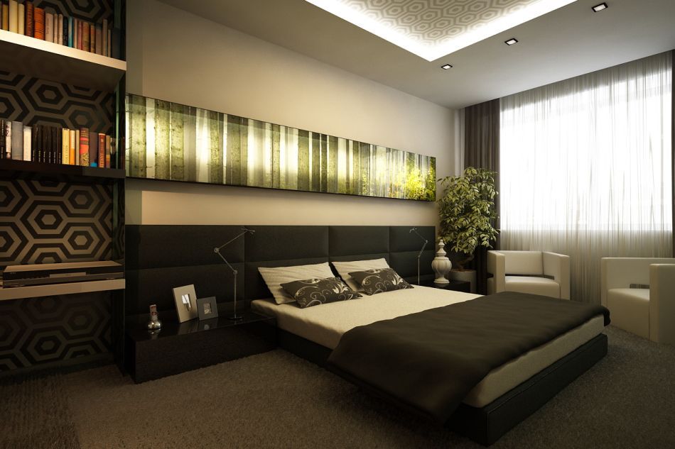 Zimmer im modernen Stil ist eine ausgezeichnete Lösung für Menschen, die von traditionellen und klassischen Interieurs müde sind. Zum Beispiel können Sie vor einer mit dunklem Holz getäfelten halbglänzenden Akzentwand ein helles Bett mit goldener Bettwäsche und dunklen Kissen stellen. Legen Sie einen nahtlosen dunklen Laminat oder Fliese auf den Boden. Stellen Sie Lichtschränke mit mattierten Türen und Chromlampen in der Nähe des Bettes und einen weißen Ledersessel und eine schwarze Stehlampe am Fußende des Bettes.