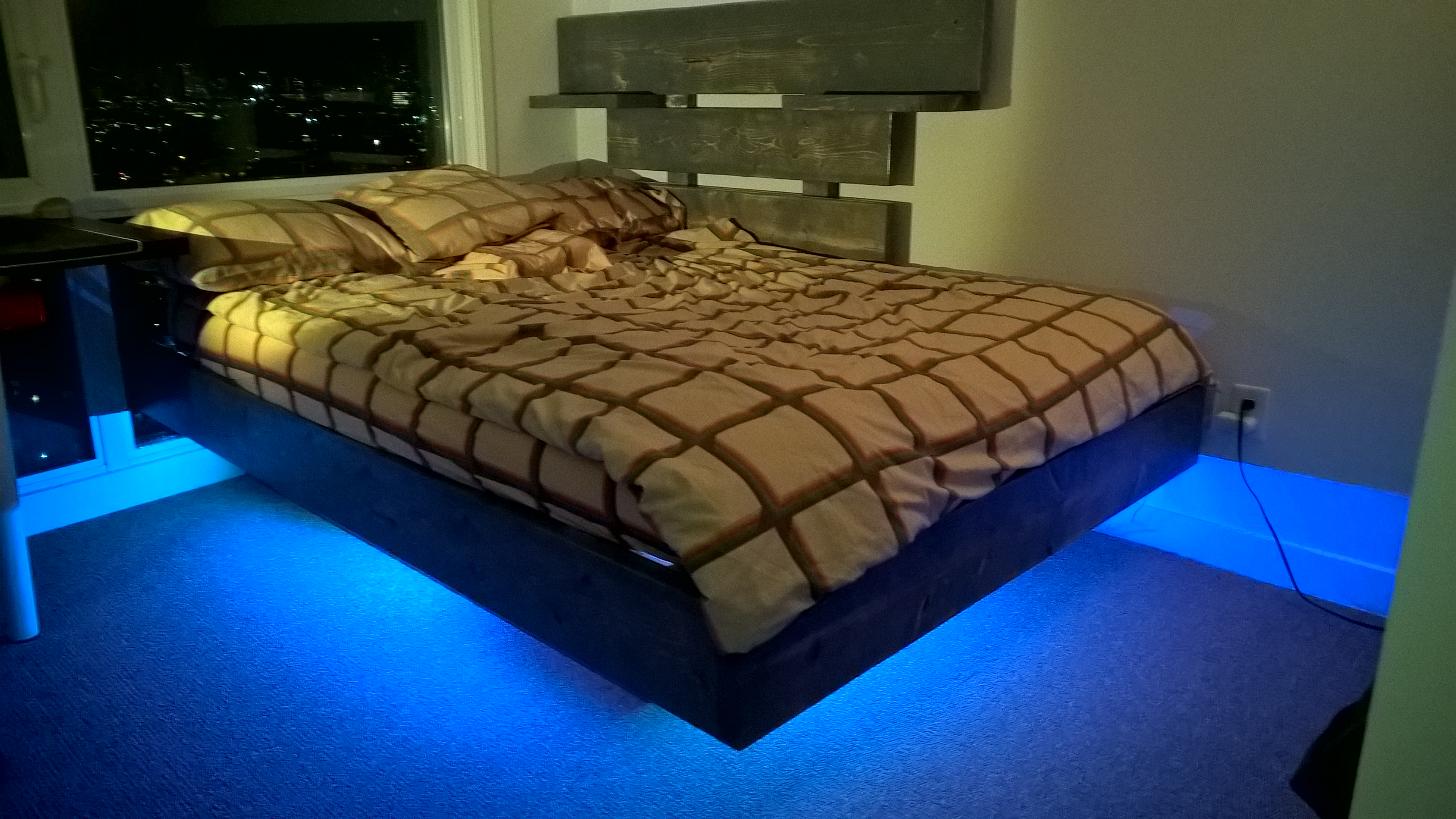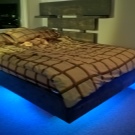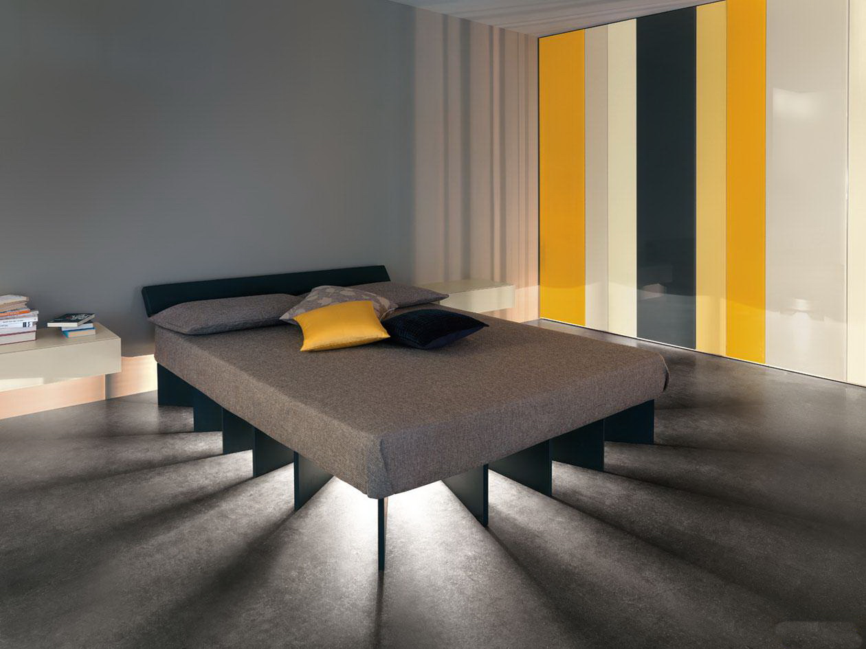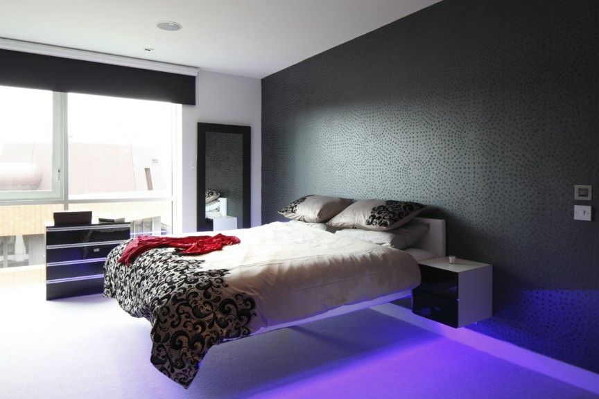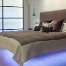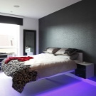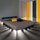 Oft werden solche Möbel im Schlafzimmer durch wunderschöne LED-Beleuchtung ergänzt. Wählen Sie dazu Farbbänder in angenehmen und beruhigenden Farben, zum Beispiel grün oder blau. Es ist besser, schreiende rote oder hellrosa Glühbirnen abzulehnen und einen Platz für sie in anderen Räumen im Haus zu finden.