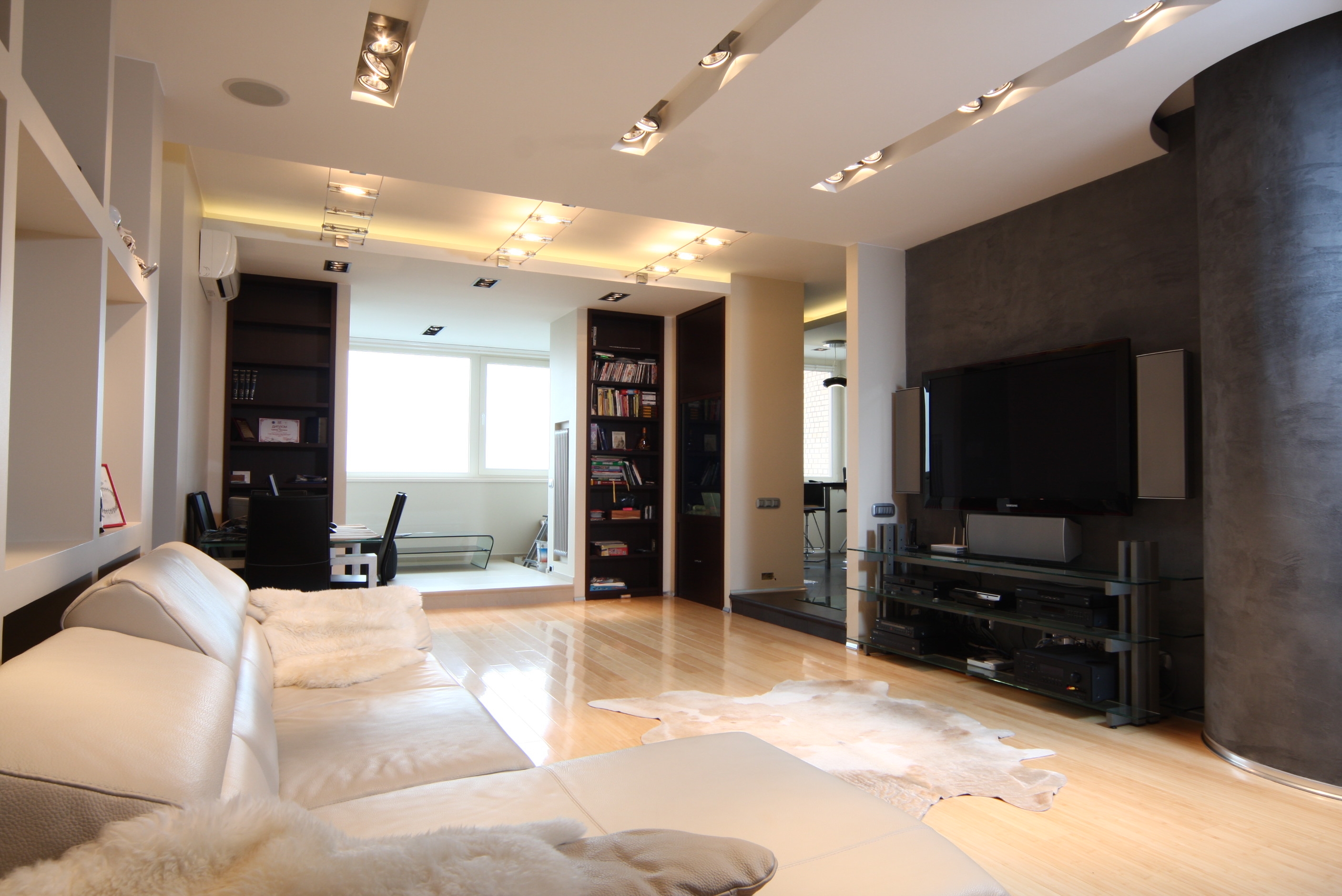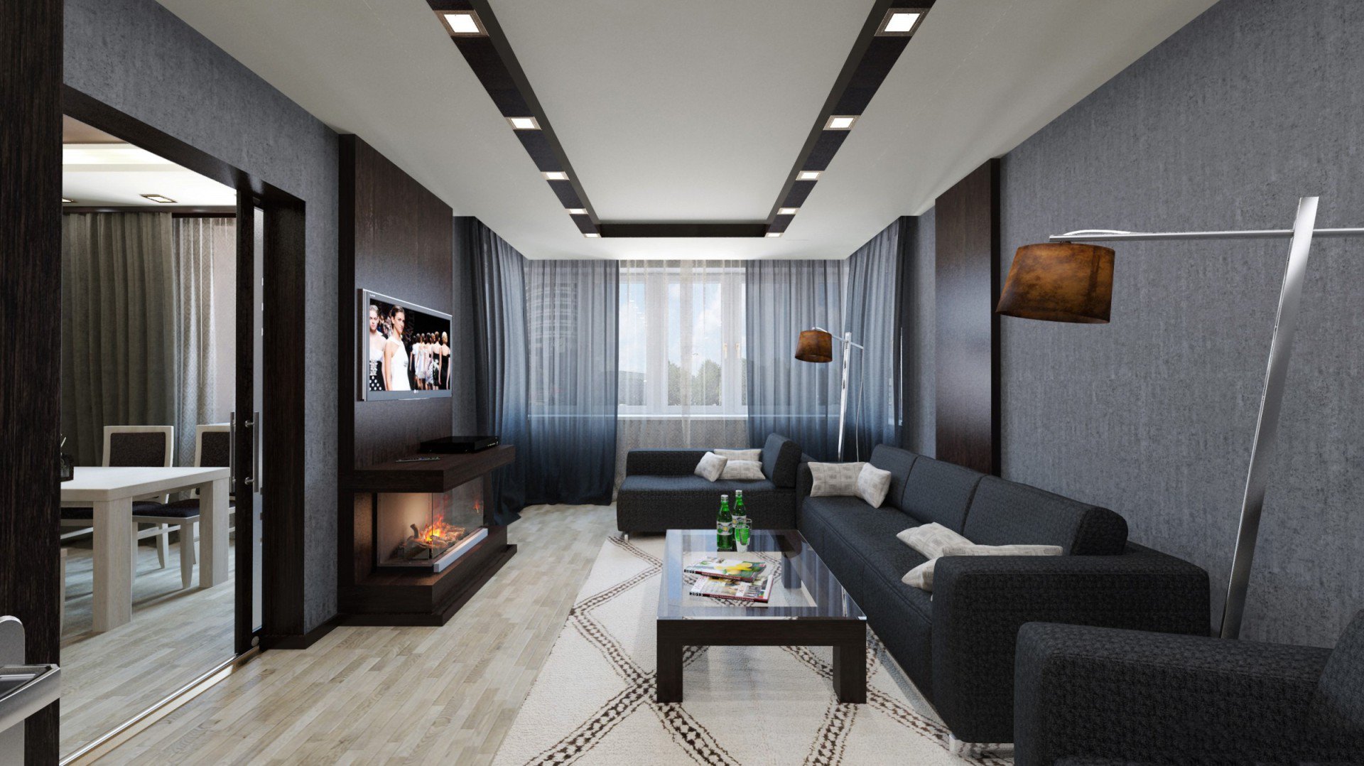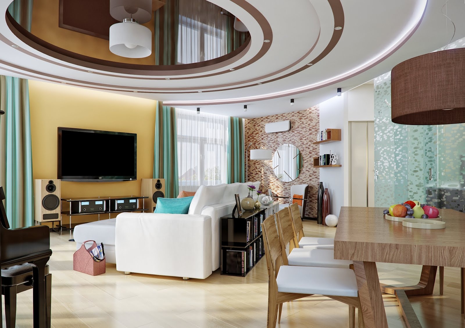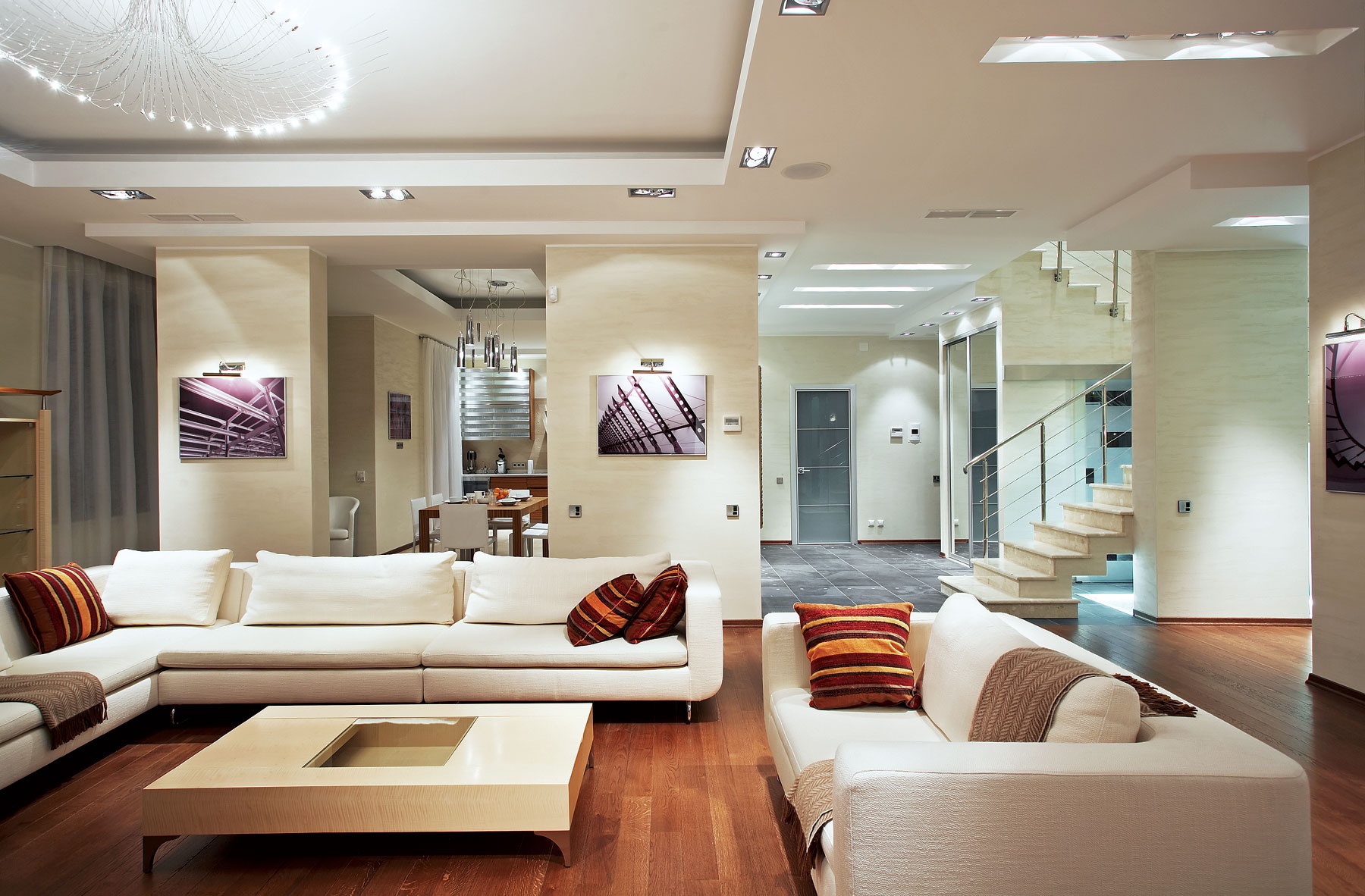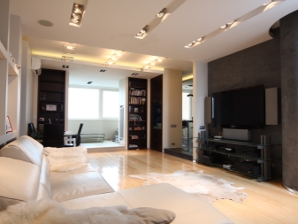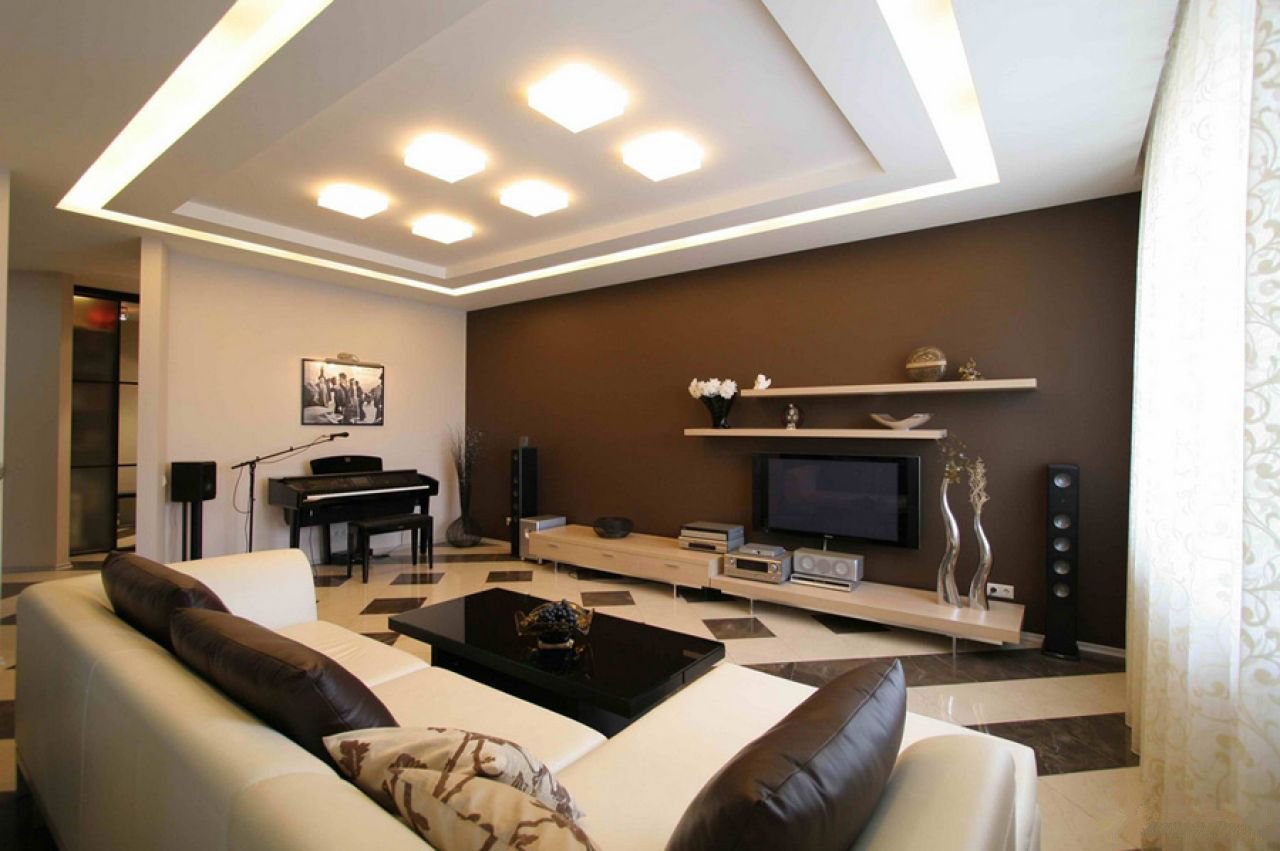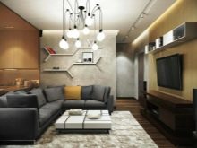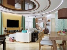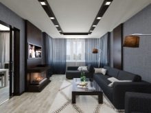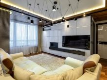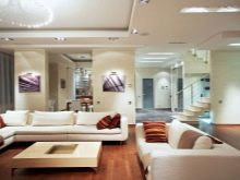 Das Wohnzimmer im modernen Stil kann mit einer streckenden, glänzenden oder matten Decke ausgestattet werden. Es kann auch geschichtet sein. In der Regel werden solche Komponenten durch Strahler oder Kronleuchter des entsprechenden Stils ergänzt.