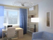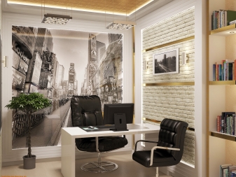 In solchen Räumen sehen auch Tische mit einer Holzplatte gut aus. In der Regel werden solche Details aus modernen Stilen herausgeschlagen, aber nicht in der Anordnung des Arbeitsbereiches. Hier wird die Holzstruktur harmonisch aussehen, denn sie vermittelt das solide Bild des Ensembles. Die Akzentwände sind auch in Arbeitsräumen akzeptabel. Zum Beispiel kann es sich um eine der Überlappungen handeln, die unter dem weißen Stein mit Tapeten beschnitten sind. Um zu verhindern, dass dieser Raum zu sachlich und leblos wirkt, empfehlen die Designer, ihn in geeigneten Töpfen und Vasen mit lebenden Pflanzen zu ergänzen.