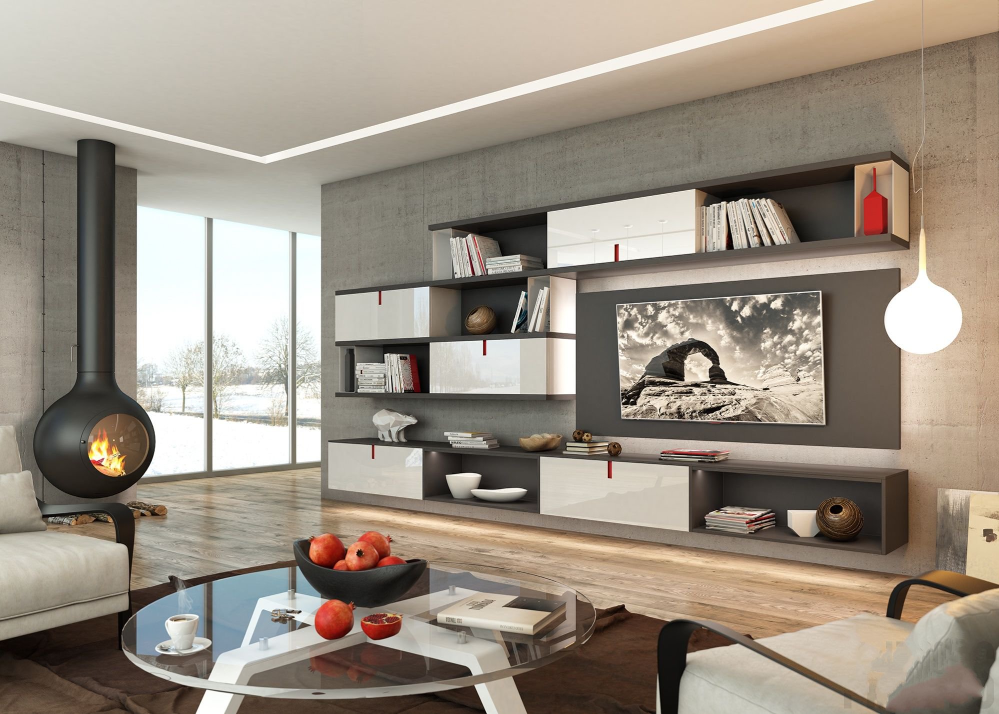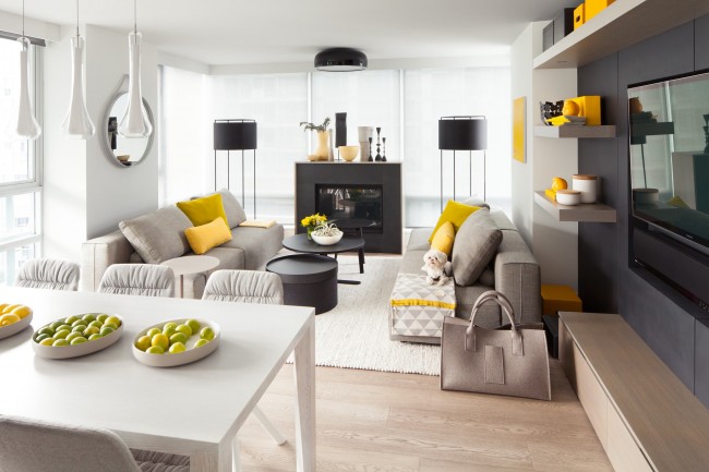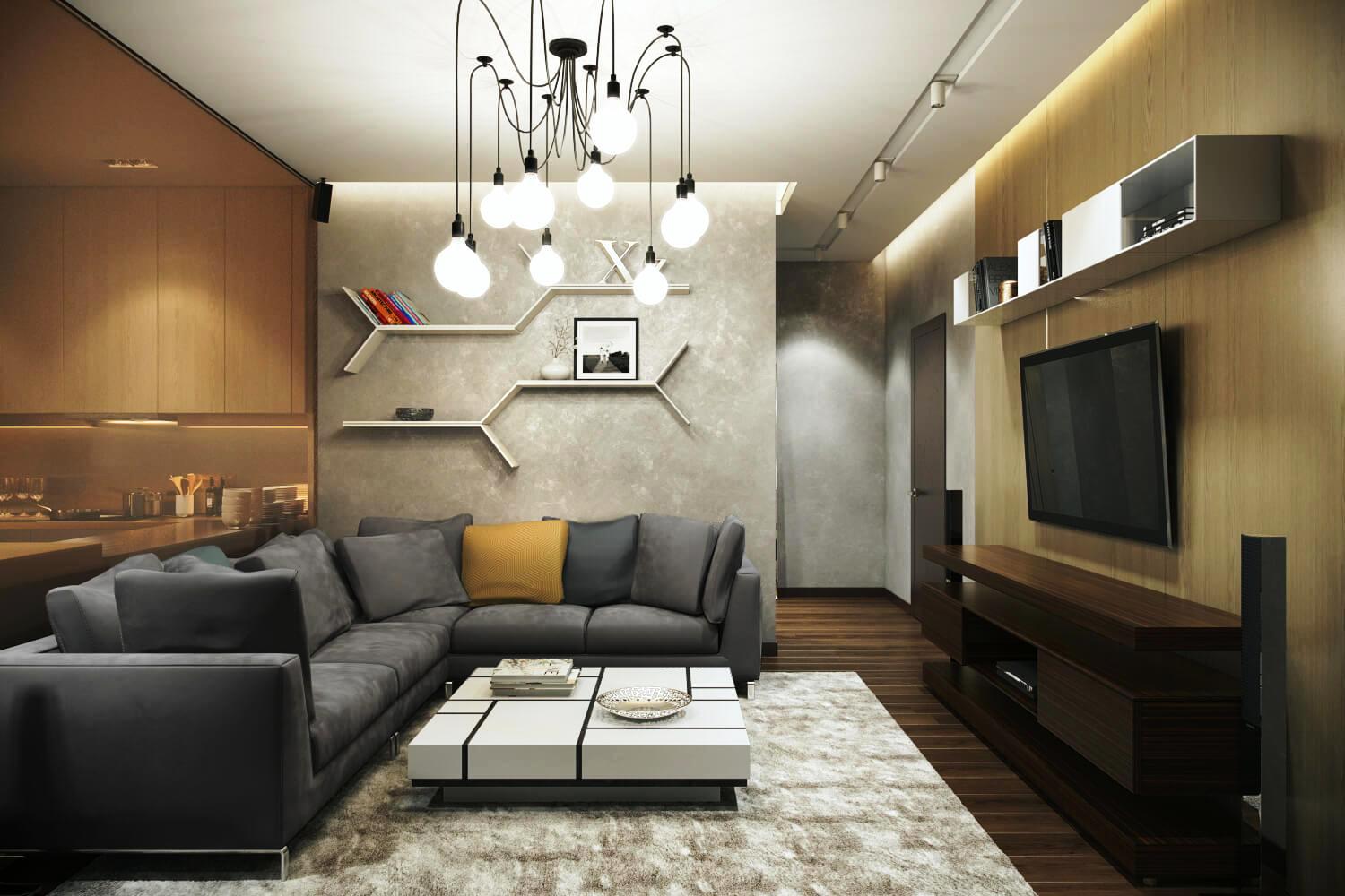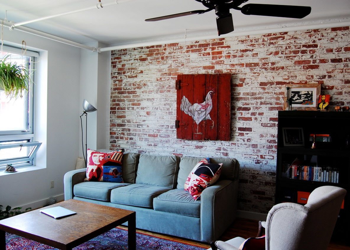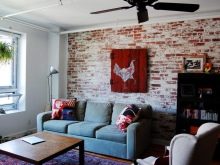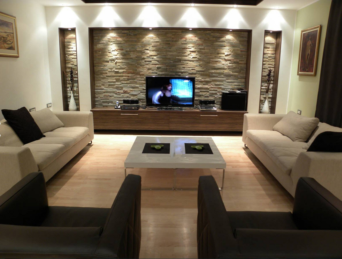 Für moderne Wohnzimmer Akzent Wand ist ein Muss.Es kann hinter der Couch oder TV positioniert werden. Meistens entscheiden sich die Besitzer für diese leichten Ziegel oder Mauerwerk (natürliche oder künstliche), sowie Original-Tapeten mit kontrastierenden modernen Prints oder stilvollen Mustern.
