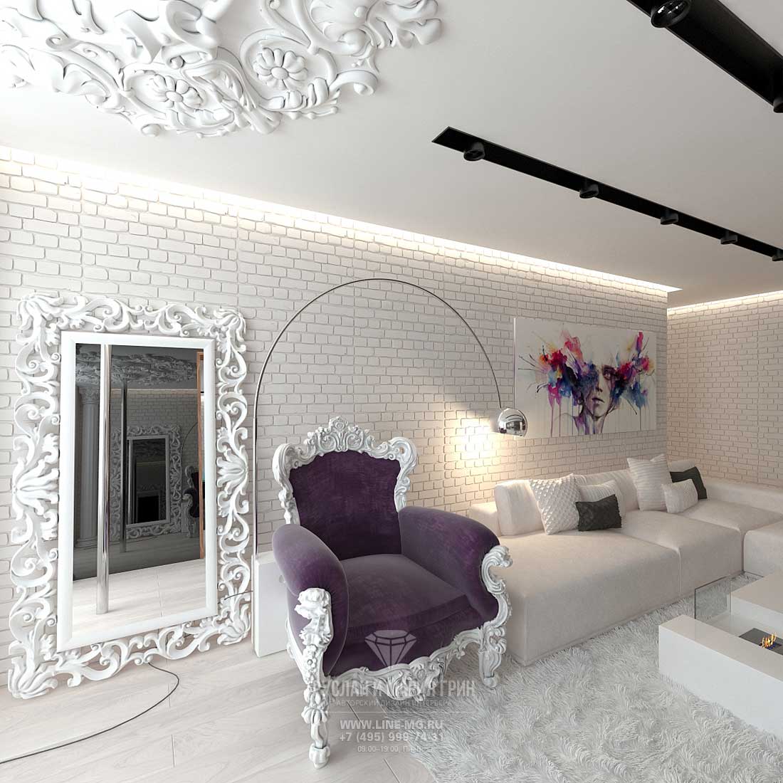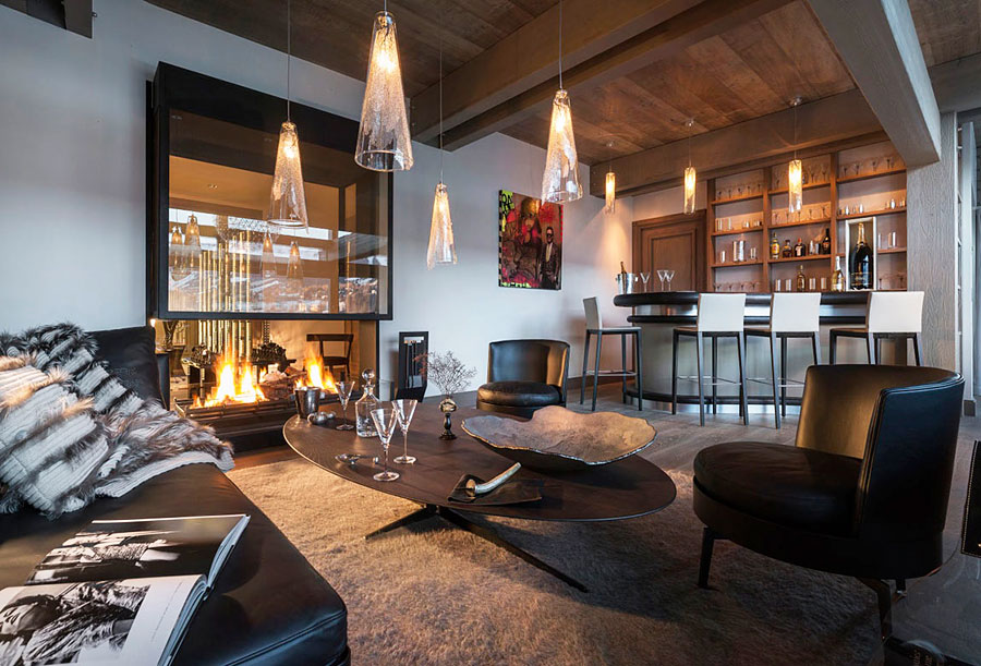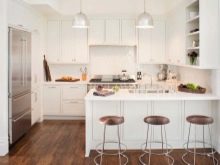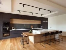 In der geräumigen weißen Küche oder im Essbereich sieht ein großer Bartisch mit einer schneeweißen Insel aus. Dieser Entwurf sollte mit Metallstühlen mit schwarzen Sitzen ergänzt werden. Willst du ein wirklich einzigartiges Ensemble machen? Platzieren Sie dann ein mattes, dunkelgraues Set in der Nähe der Wand hinter der Bar, das aussieht, als würde es zu einer einzigen Struktur verschmolzen. Vervollständige den Innenraum mit schwarzen Schienenleuchten.