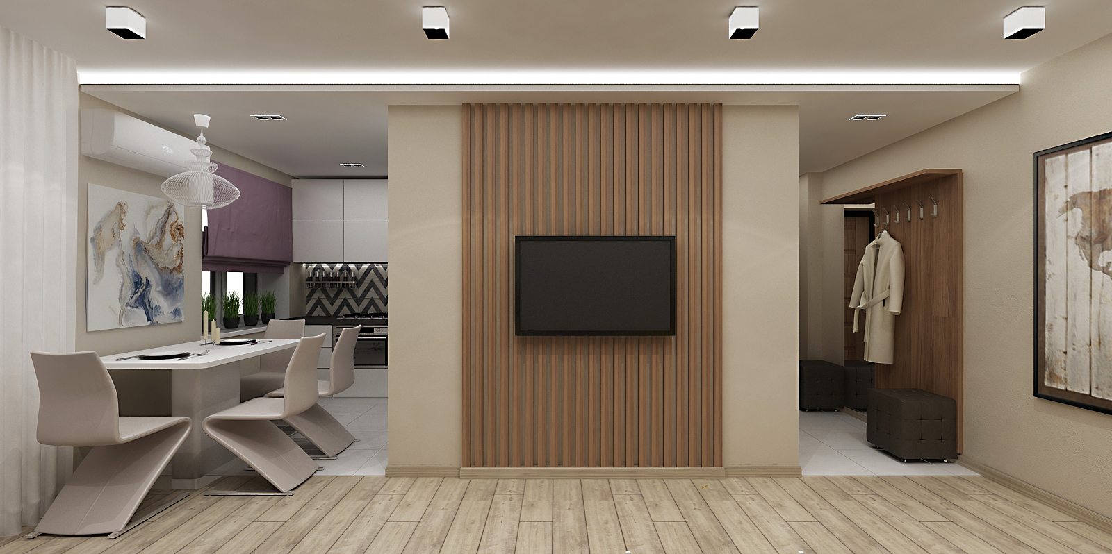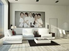 Ein gemütliches Wohnzimmer in einem privaten Haus, in modernem Stil entworfen, kann mit weißen Materialien beendet werden, und der Boden - mit braunem Parkett. Unter solchen Bedingungen finden ein schwarzes Ledersofa mit weißen Kissen, ein mattschwarzer Teetisch, weiße Stühle mit Metallbeinen, ein wandmontierter Fernseher (vor Polstermöbeln) und große Wandgemälde mit kontrastierenden Farben ihren Platz.