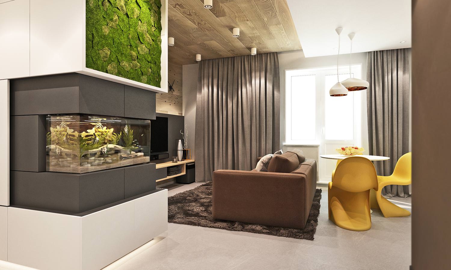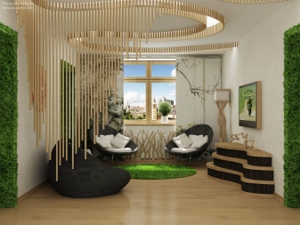 Bei der Gestaltung dieses Raumes empfiehlt sich die Bezugnahme auf die drei Hauptfarbtöne.Mit ihrer Hilfe wird es möglich sein, ein organisches und ästhetisches Bild zu schaffen, das nicht mit einer großen Anzahl von zusätzlichen Farben überladen ist.