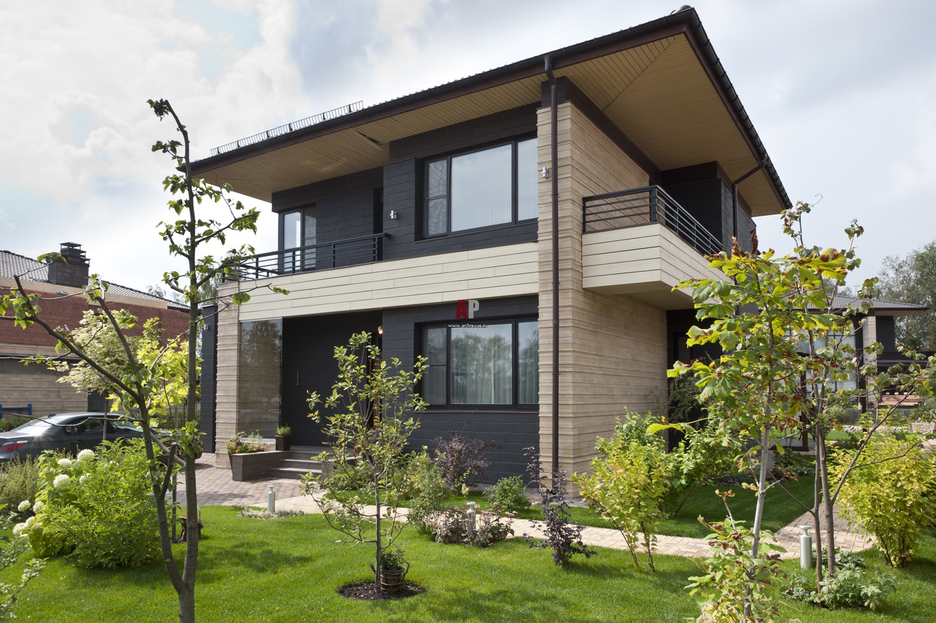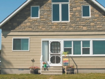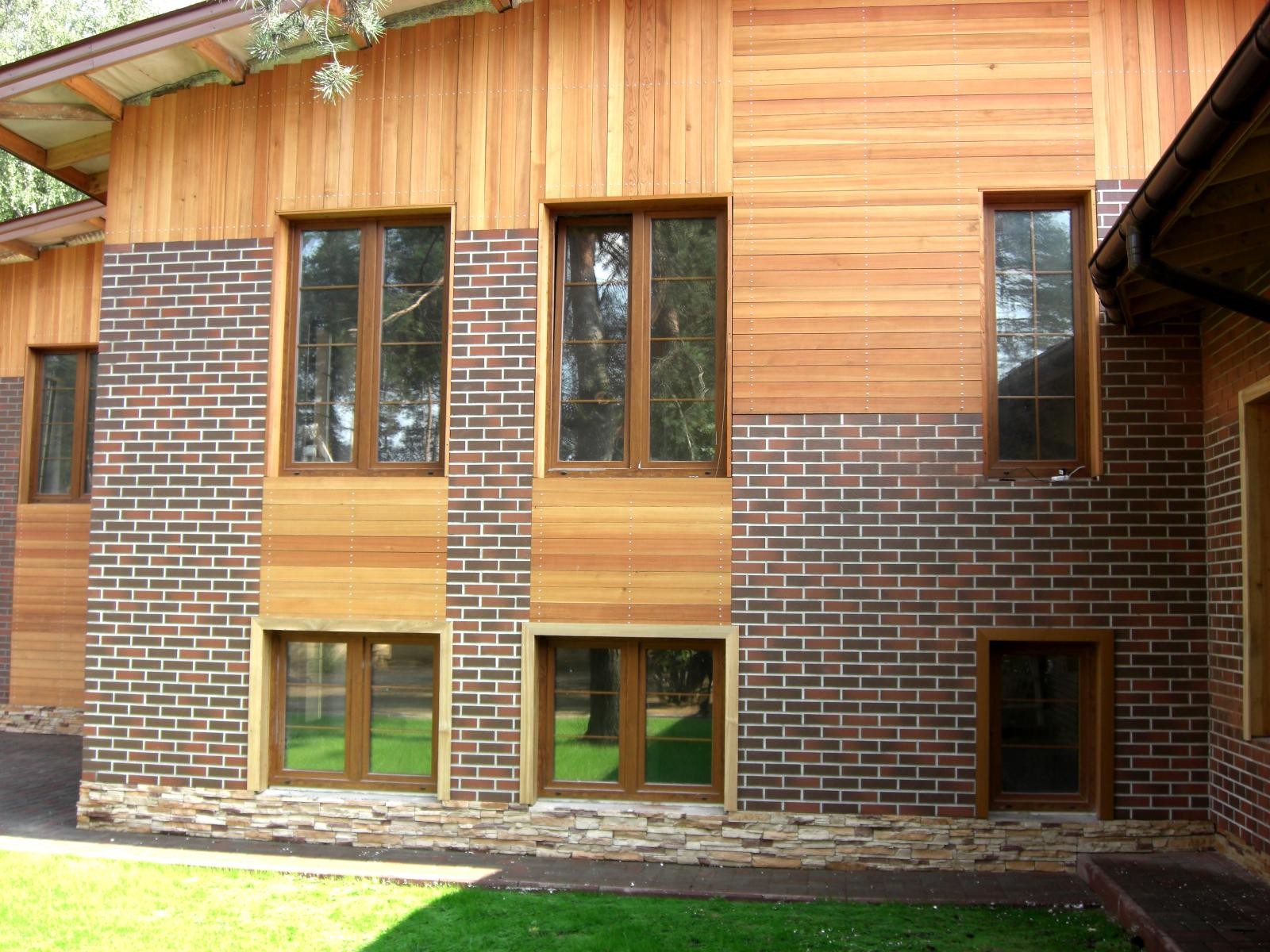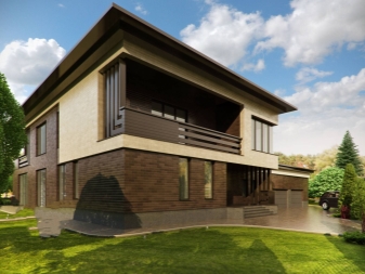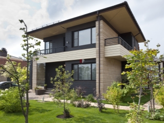 Ein weiteres charakteristisches Merkmal moderner Privathäuser ist, dass sie eine Vielzahl von Kombinationen von Materialien für die Außendekoration kombinieren können. Viele Besitzer bevorzugen heute spektakuläre Tandems aus Backstein und Holz,Gips und Holzplatten oder Stein. Diese Lösungen sehen sehr frisch und originell aus.