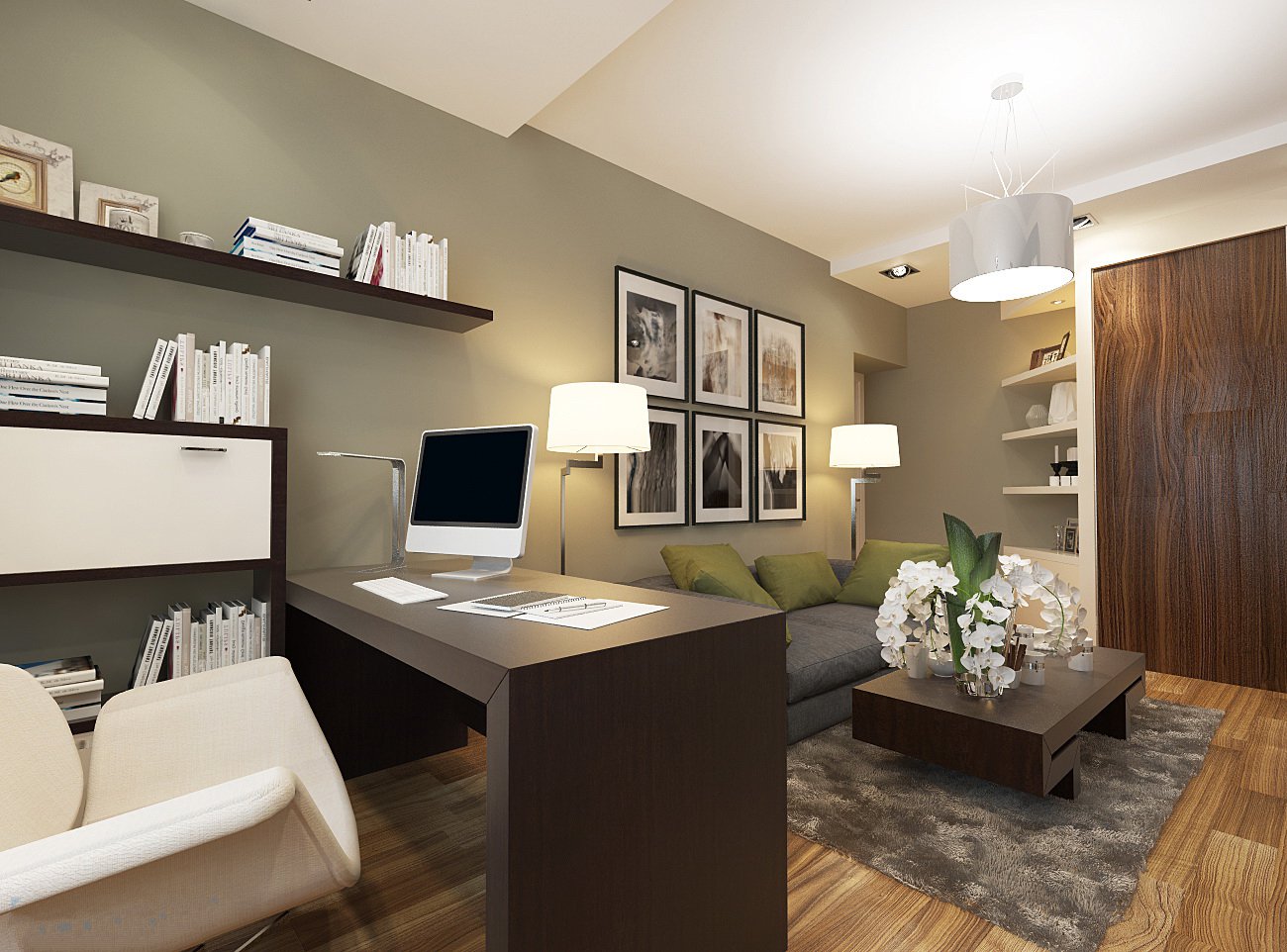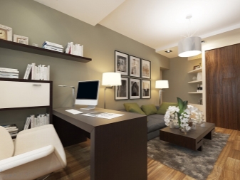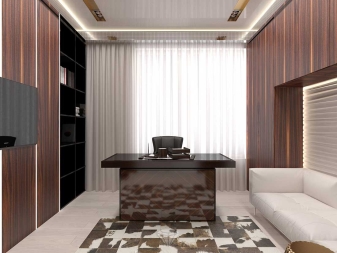 Viele Leute machen private Büros in Privathäusern aus. Diese Räume sollten sich durch eine solide, aber nicht auffällige Erscheinung auszeichnen. In diesem Fall sollte der moderne Stil in harmonischen Kontrasten, prägnanten Formen und Designs sowie schönen und hochwertigen Materialien zum Ausdruck kommen.