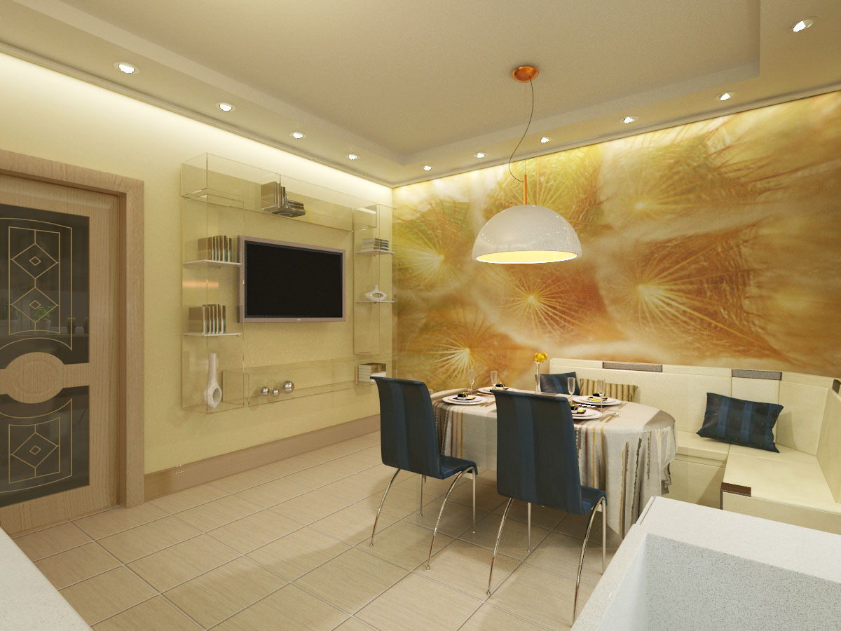 Im Esszimmer, wie auch in anderen Räumen, können Sie die schönen Akzentwände ausstatten. Zum Beispiel, in einer weichen gelben oder cremigen Einstellung, wird eine helle Wand mit einem Bild von gelb-orange Blüten oder saftigen Zitrus spektakulär aussehen.Sie verwöhnt nicht nur Langeweile, sondern erlaubt ihr auch, das Ensemble mit kontrastierenden blauen Stühlen auf Metallrahmen und Glaswandregalen erfolgreich zu schlagen.