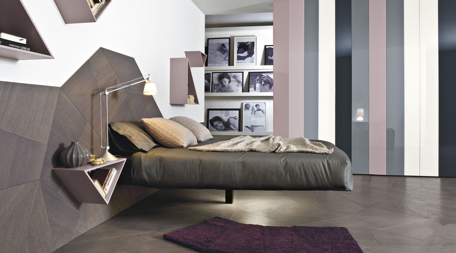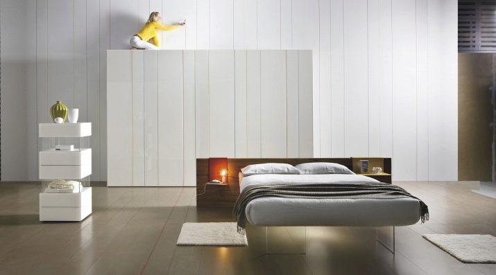 Besonders beeindruckend und attraktiv in progressiven und futuristischen Zimmern sieht das gleiche progressive Möbel aus. Zum Beispiel kann anstelle eines Standard-Doppelbettes mit Leinenschubladen oder breiten Stützen ein ungewöhnliches "schwimmendes" Modell verwendet werden, bei dem nur ein einziges, aber zuverlässiges Bein aus transparentem Material besteht, das es unsichtbar macht.