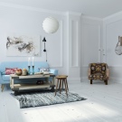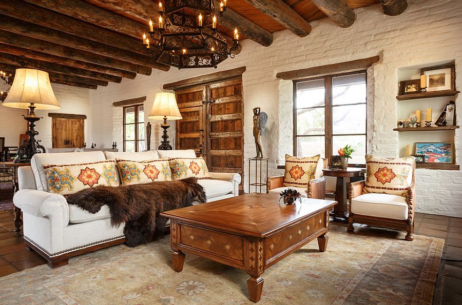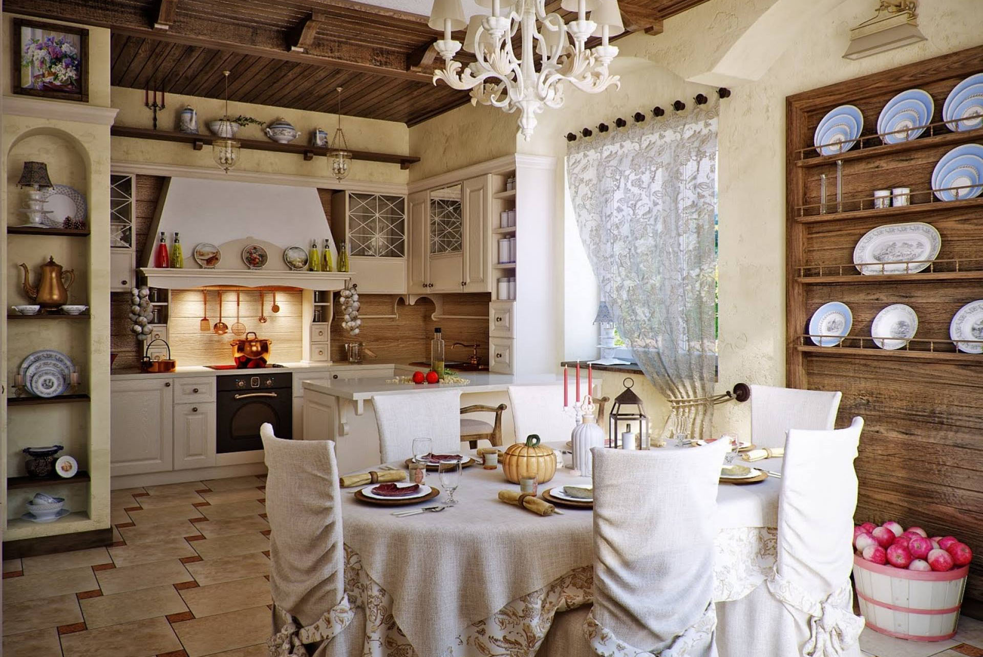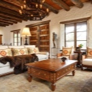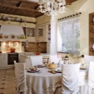 Dieses Design ist ideal für Liebhaber von hellen Räumen, die sich durch Einfachheit im Design aus natürlichen Materialien auszeichnen. Diese Richtung ist sehr wichtig in einem Dorf oder Landhaus, da es so nah wie möglich an der Natur ist. Holzmöbel, antike Kommoden und Kleiderschränke, die mit Schnitzereien oder schmiedeeisernen Elementen verziert werden können, sind hier immer relevant. Für den Boden ist die beste Option Parkett,über die Wege und Teppiche mit Folgemotiven in Form von Mustern gelegt werden. Die Prioritätsfarben des Designs sind blau, gelb, beige und braun.