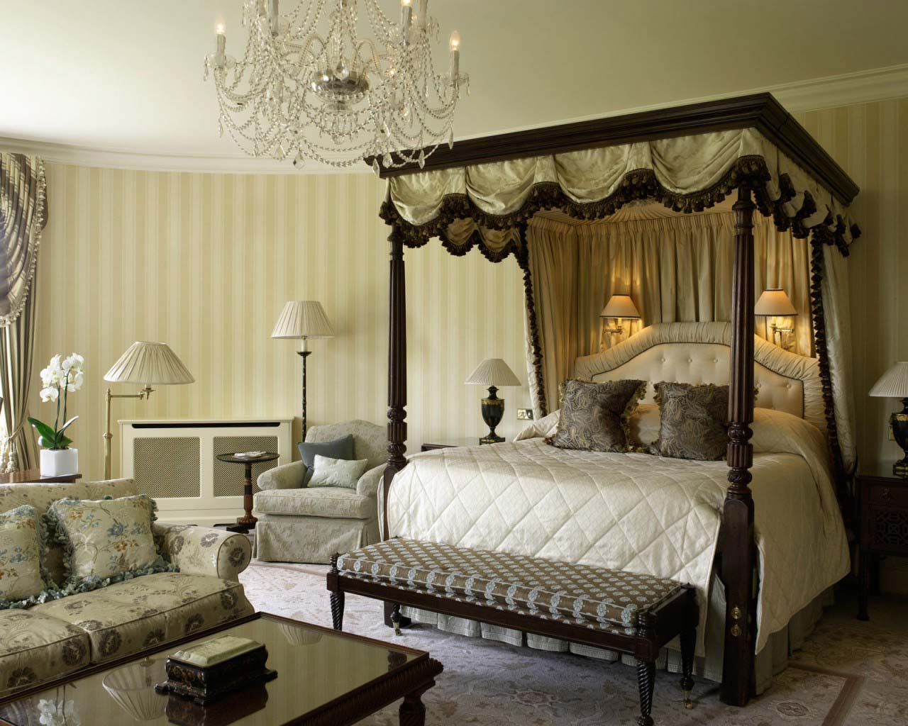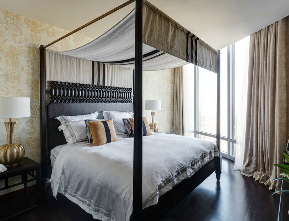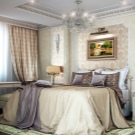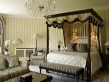 Für Kenner des konservativen Komforts, sowie Liebhaber des reichen Dekors, wird dieser Designstil die beste Lösung sein. Die traditionelle Palette besteht aus weißen, grauen, braunen und olivenblüten. Hier werden monochrome Tapeten für die Dekoration der Wände verwendet, ebenso wie Leinwand mit Streifen oder mit dem Bild von kleinen Blumen.Das Bett zeichnet sich durch geschwungene Beine und ein hohes Kopfteil aus. Mehrschichtige Vorhänge, ergänzt durch einen großen Fall oder eine Schnürung, schaffen eine Atmosphäre der Ruhe und des Komforts im Raum.