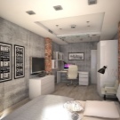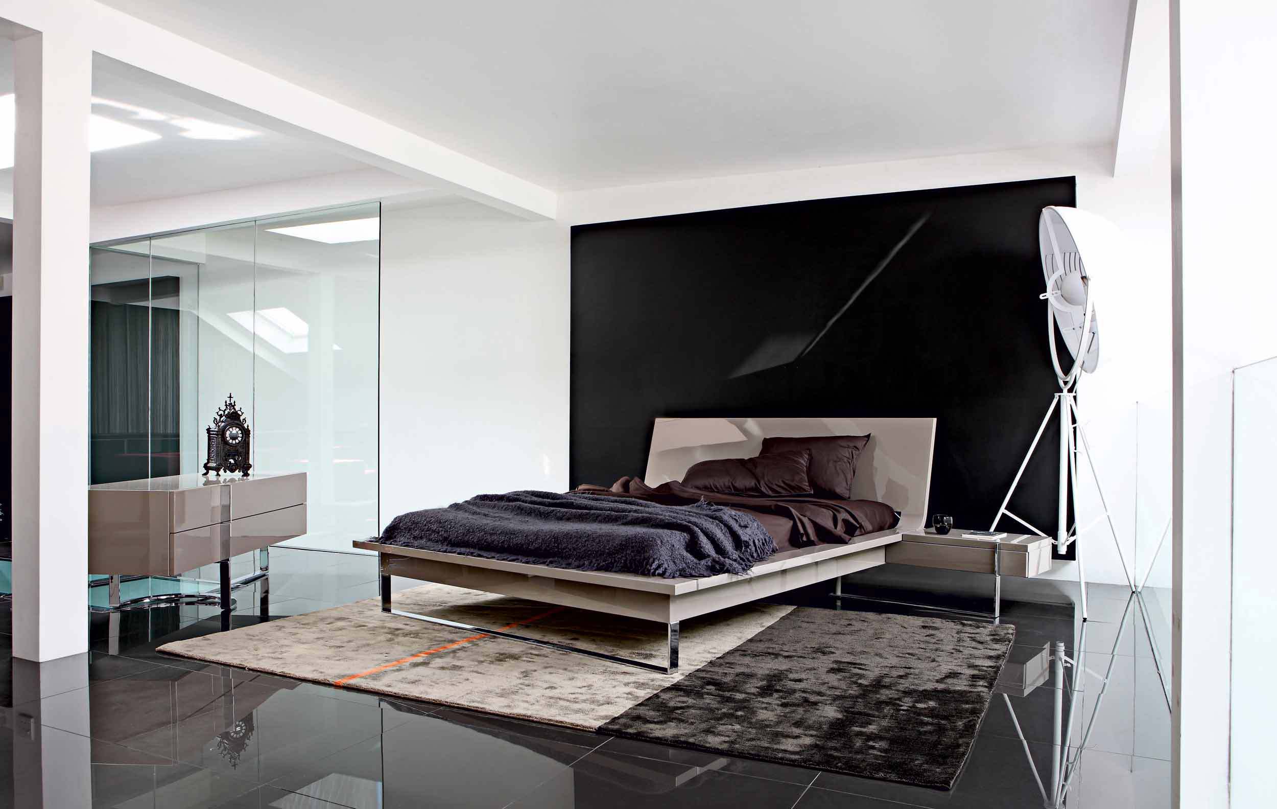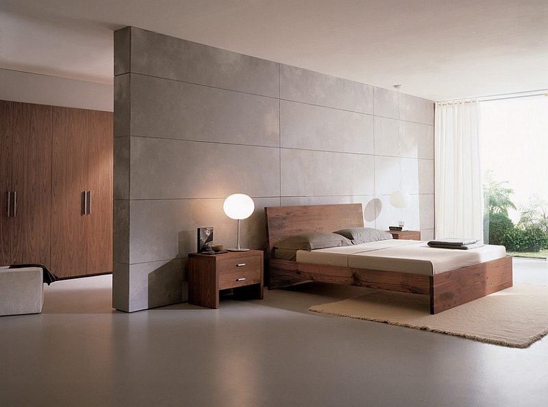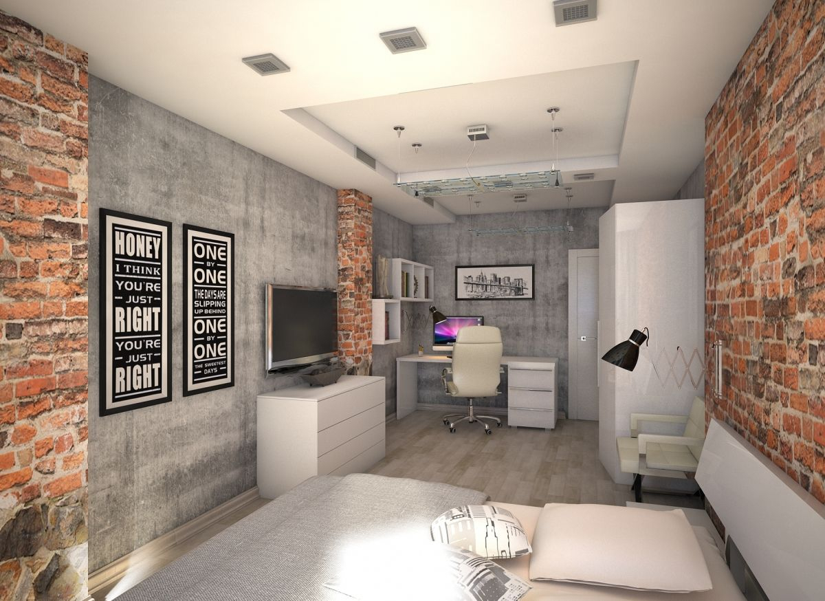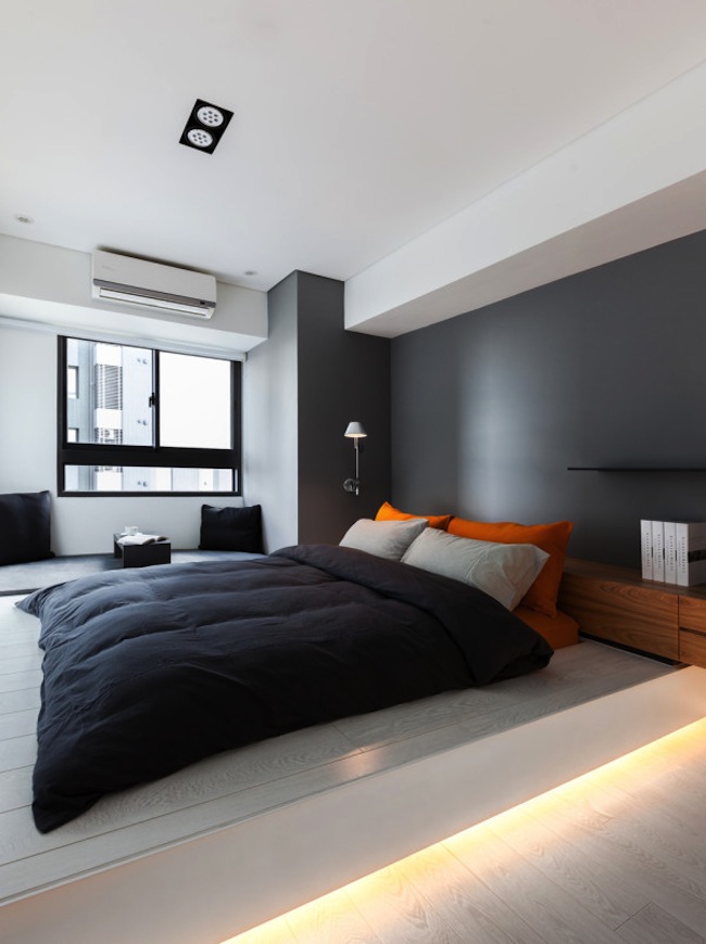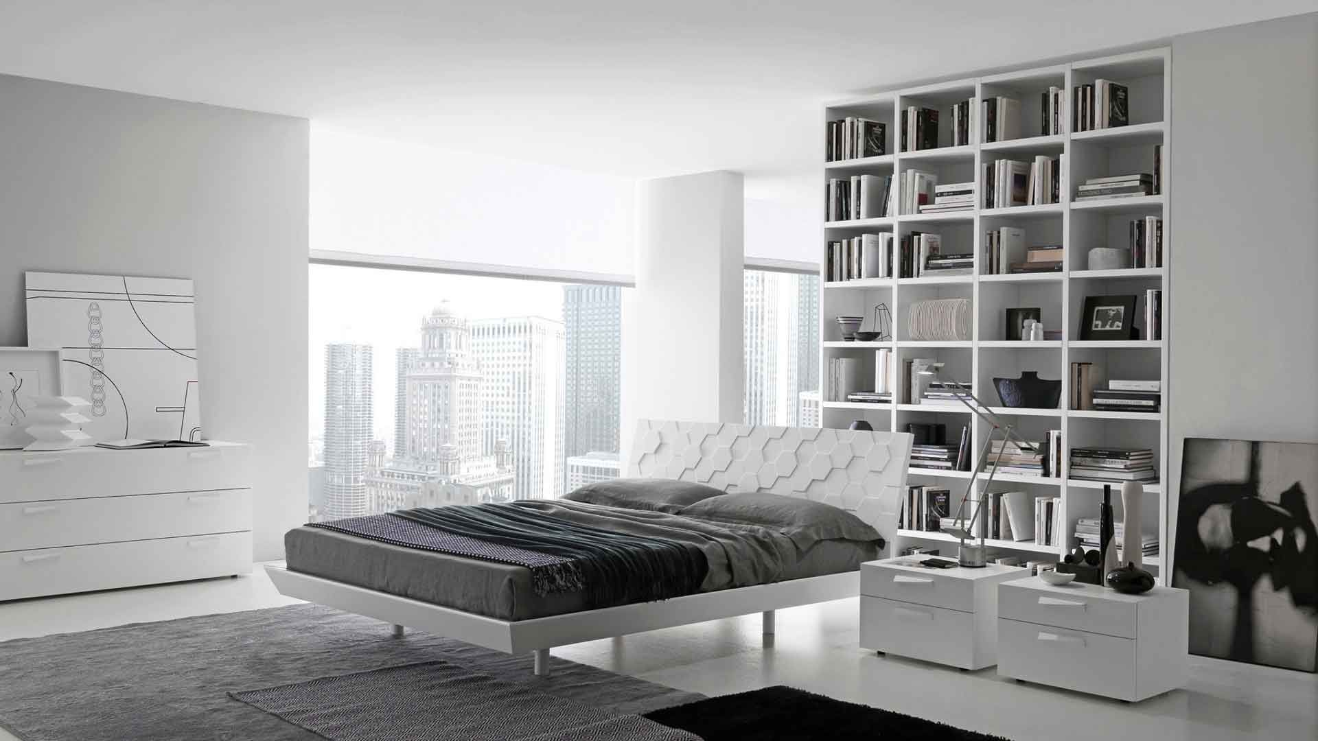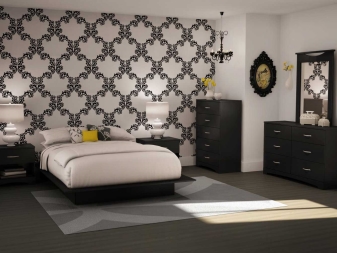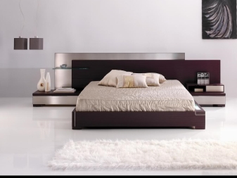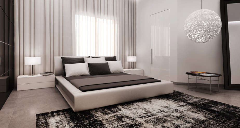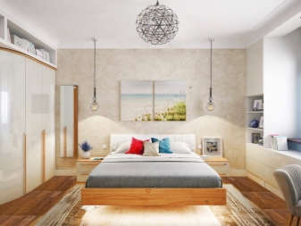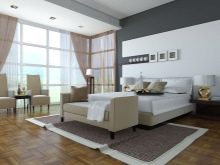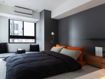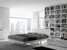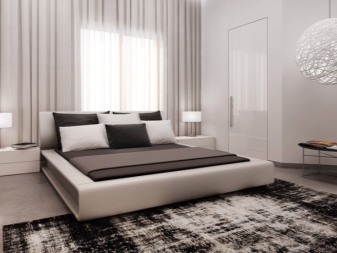 Die Wände des Raumes sind in einer Farbe gestrichen. oder kleisterte Tapete beige, grau oder sandfarben. Dekorationen sind Schwarz-Weiß-Fotografien oder Gemälde mit Abstraktionen. Diese Art von Design ist sehr dynamisch, so dass alles neu und modern ist. Möbel zeichnen sich durch geometrische und strenge Linien aus. Ein Bett gilt als ein Must-Have-Möbelstück, aber voluminöse Schränke werden durch moderne und funktionelle Regale mit vielen Regalen ersetzt. Im Allgemeinen sieht das Innere einfach aus, aber es ist sehr elegant.