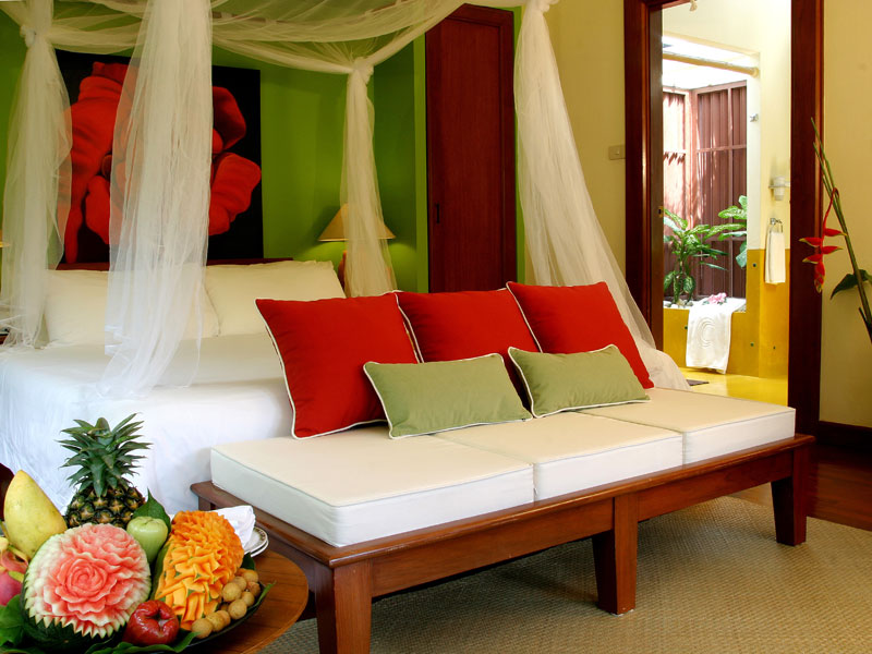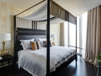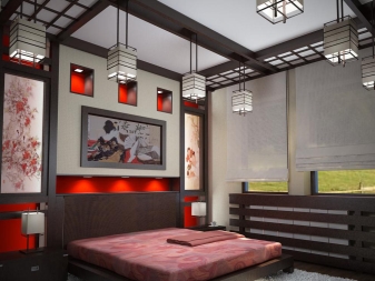Die Basis dieser Designrichtung sind natürliche Materialien und Naturtöne. Es verwendet Möbel aus Edelhölzern, Bambus und Gewehren, die in Beige, Sand oder Hellbraun gehalten sind. Obligatorischer Bestandteil des Raumes ist eine Faltwand. Betten in diesem Stil sind von einwandfreier Qualität und robuster Konstruktion, sie haben keine Beine und sind so stabil wie möglich. Als Dekorationen wurden lebende Pflanzen und Kompositionen zum japanischen Thema verwendet.