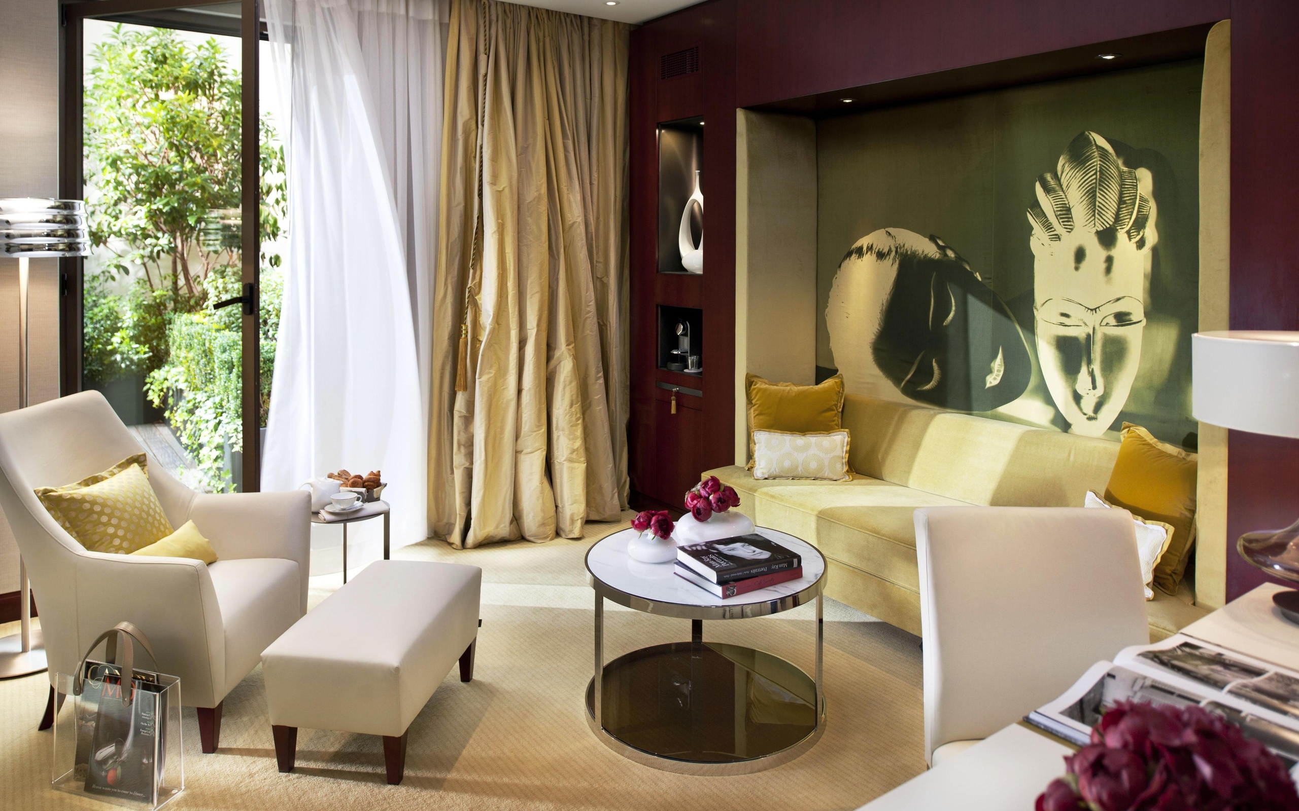 Die Möbel werden in Form von weichen und bequemen Sofas, Sesseln, Kommoden und Schränken mit Elfenbeineinlagen und modernen Möbeln präsentiert.Das Farbschema besteht aus Grün-, Schokoladen-, Creme-, Silber- und Violetttönen. Auf der Polsterung können Ornament oder große Blumen abgebildet werden.
