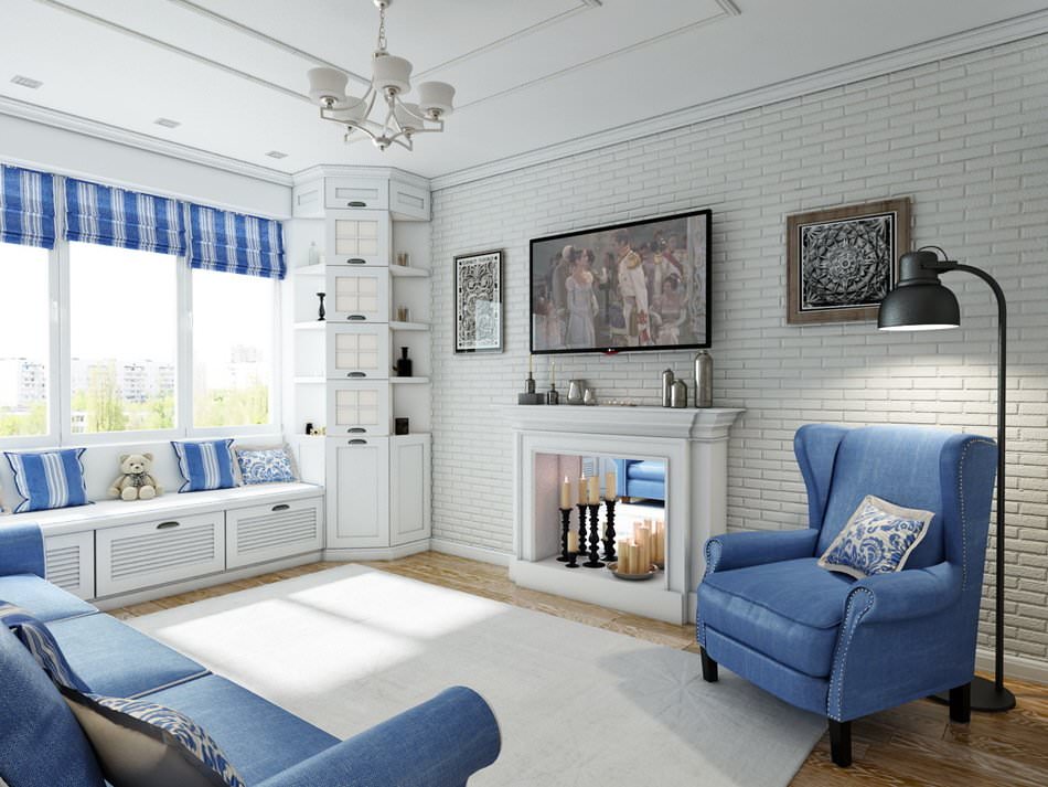 Moderner maritimer Stil erfüllt den Raum mit Frische und Erinnerungen an einen unvergesslichen Urlaub an der Küste. Die Farbpalette besteht aus blauen, blauen und weißen Farbtönen, die sich gegenseitig ergänzen sollen. Für ein Zimmer mit einem ähnlichen Design Dekoration ist perfekt als einfarbige Möbel und in einem Streifen oder mit dem Bild von anderen Meeresmotiven.