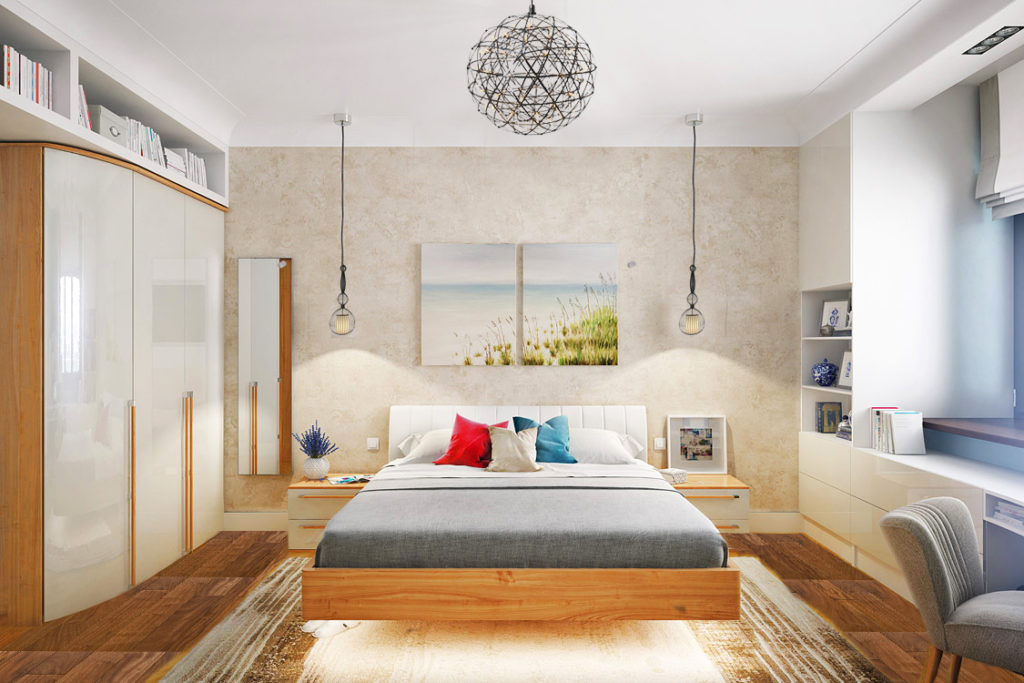 Das Farbschema dieses Interieurs ist sehr ruhig, da es in natürlichen Farben ausgeführt wird. Besonders oft werden bei der Gestaltung der Räume warme Holz- und Steintöne verwendet. Die Dekoration der Wände zeichnet sich durch Einfachheit aus, so dass die Wände grundsätzlich perfekt verputzt und in einer bestimmten Farbe gestrichen sind. Der Boden besteht aus Brettern, die sorgfältig getönt oder mit weißer Farbe bedeckt sind.Ein multifunktionales Bett aus Naturholz, mit einer warmen Decke und schönen Kissen, erfüllt den Raum mit einer warmen und positiven Atmosphäre.