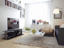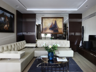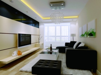 Das Sofa wählt am besten Pastelltöne mit dunklen Holzeinlagen. In der Mitte des Raumes sollte ein Tisch mit einer glänzenden rechteckigen monophonen Tischplatte platziert werden, denn er kann braun, schwarz oder dunkelgrau sein.