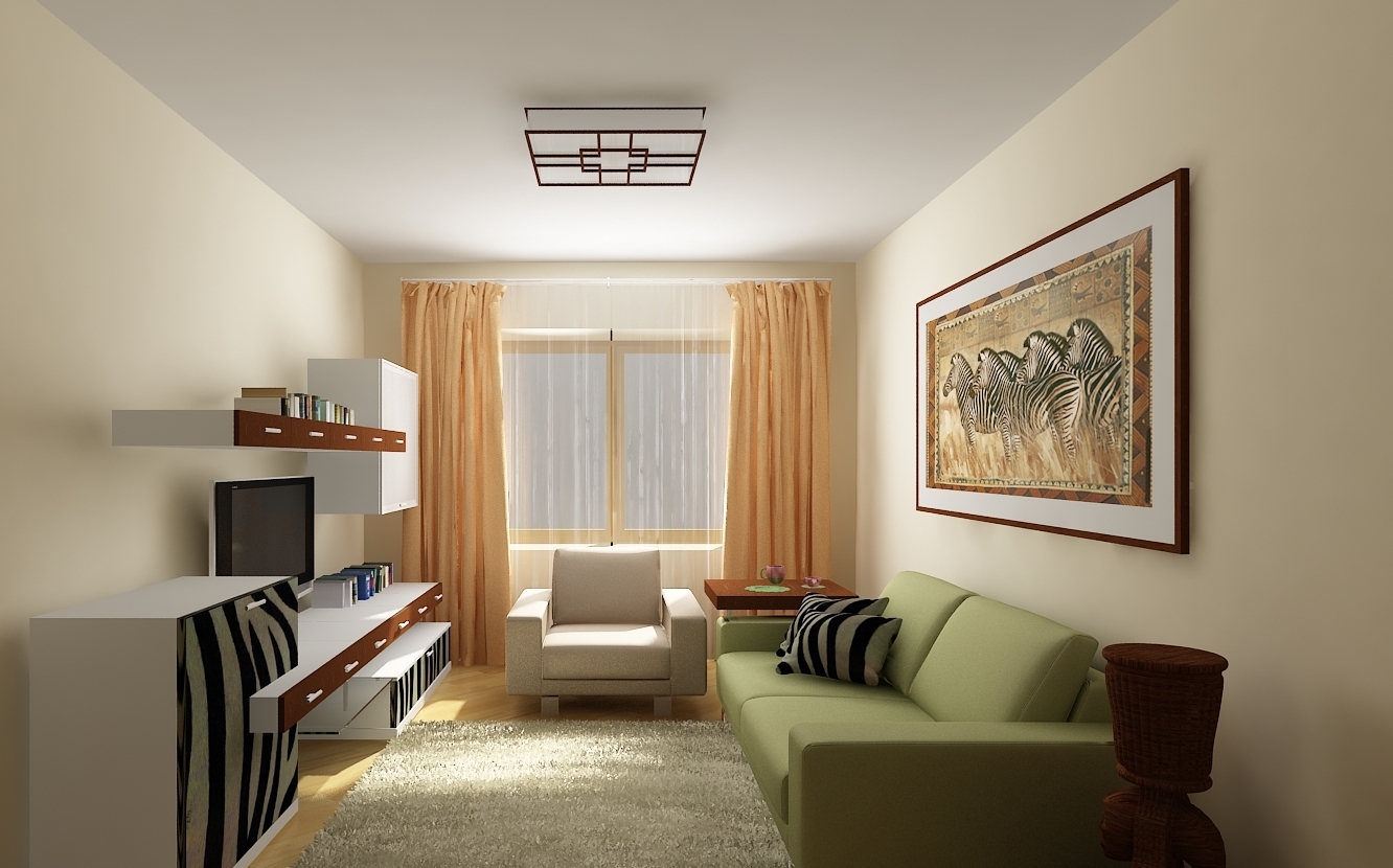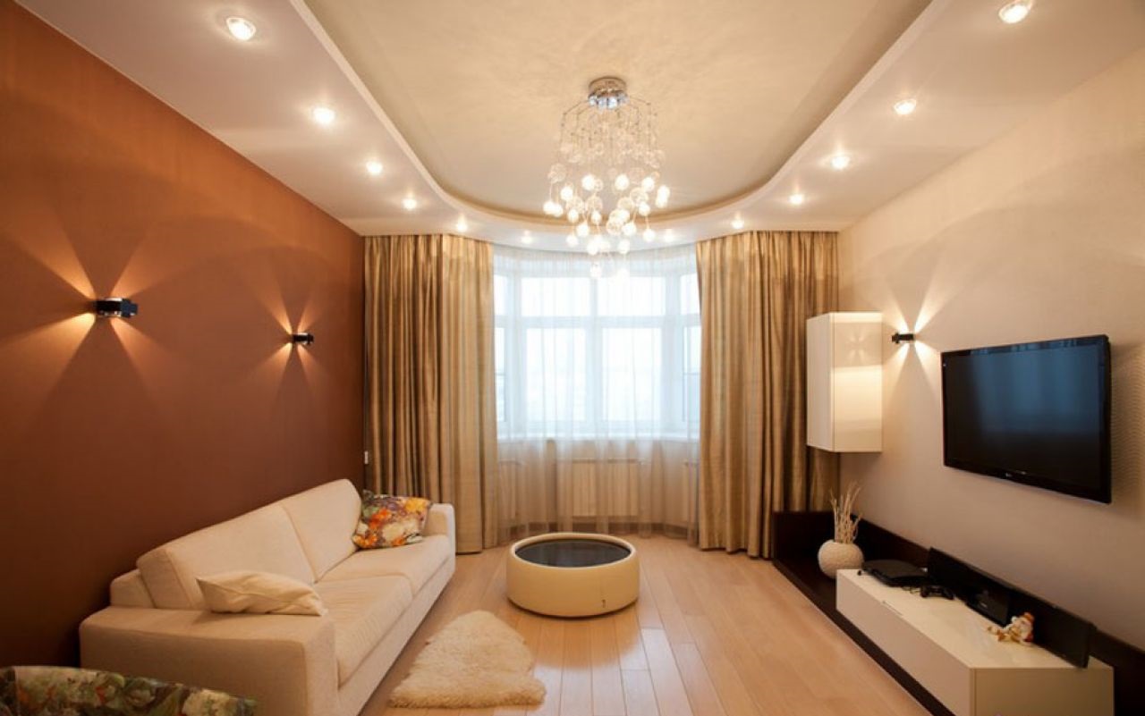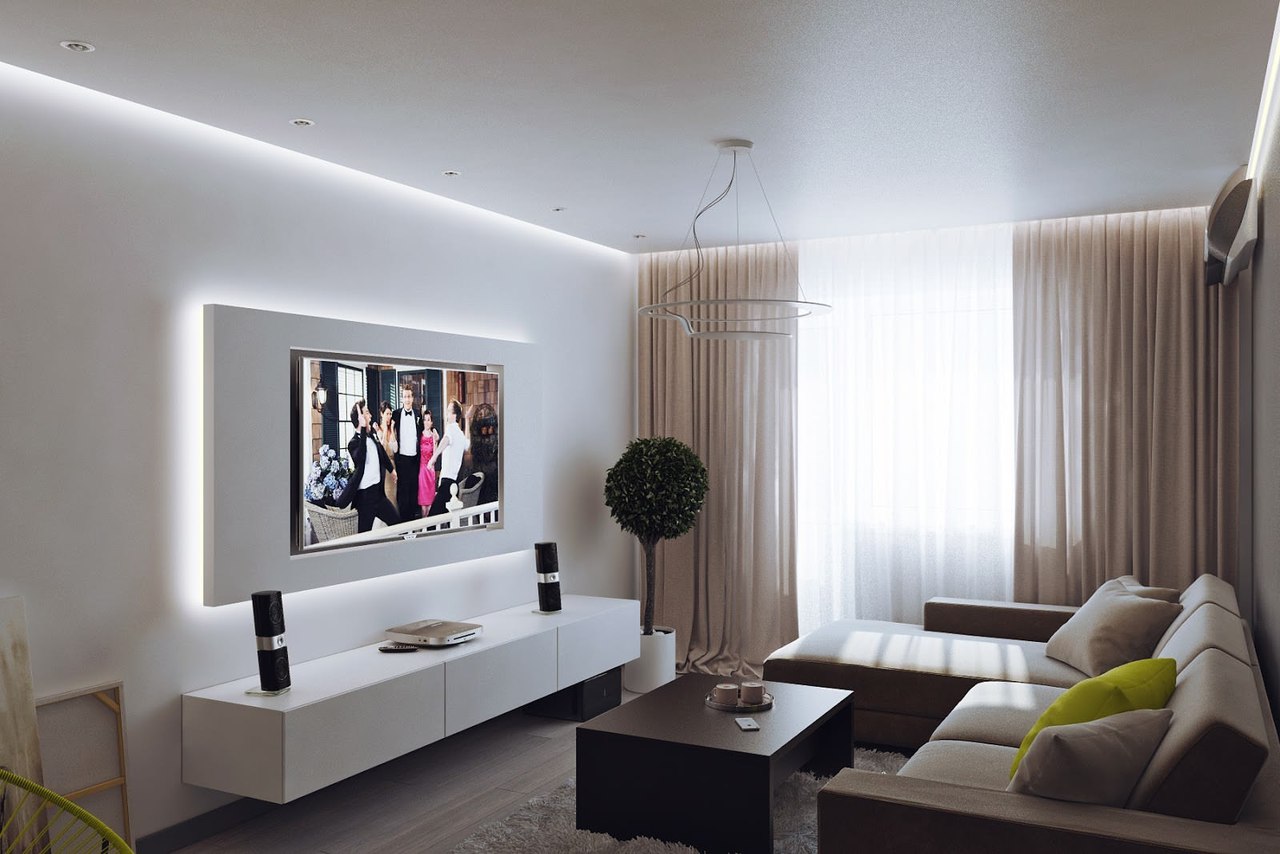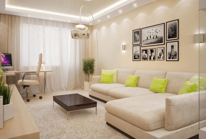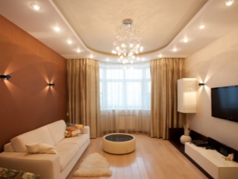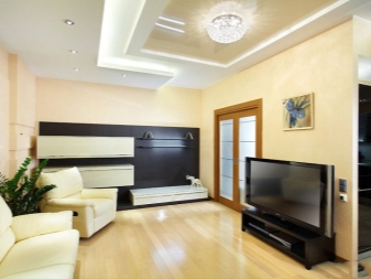 Wenn Sie das Wohnzimmer von einer kleinen Größe machen, können Sie eine feste weiße Decke verwenden. Die Wände sollten etwas dunkler (beige, hellbraun) sein. Bodenbelag geeignet, um in hellen Farben durchzuführen.