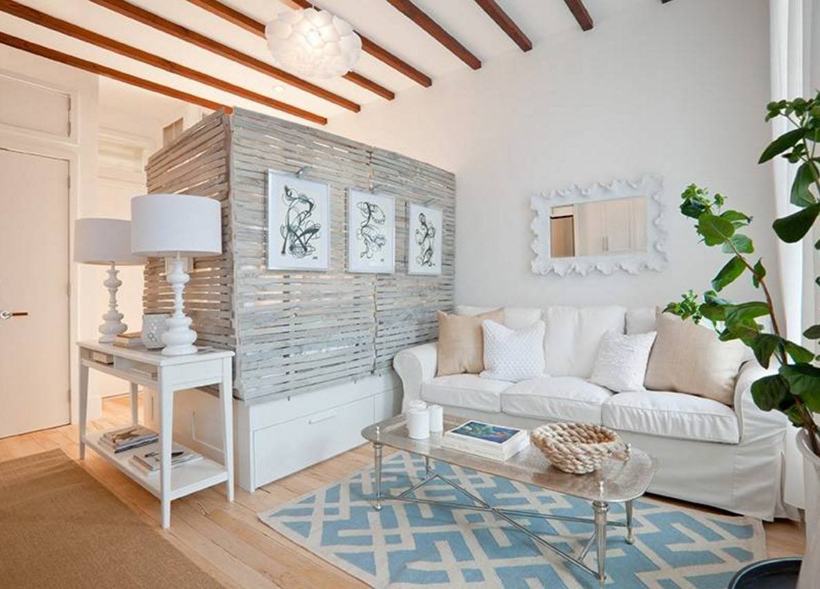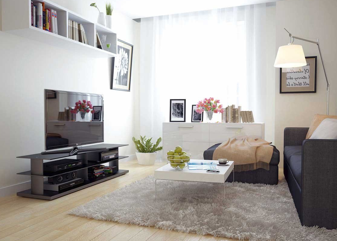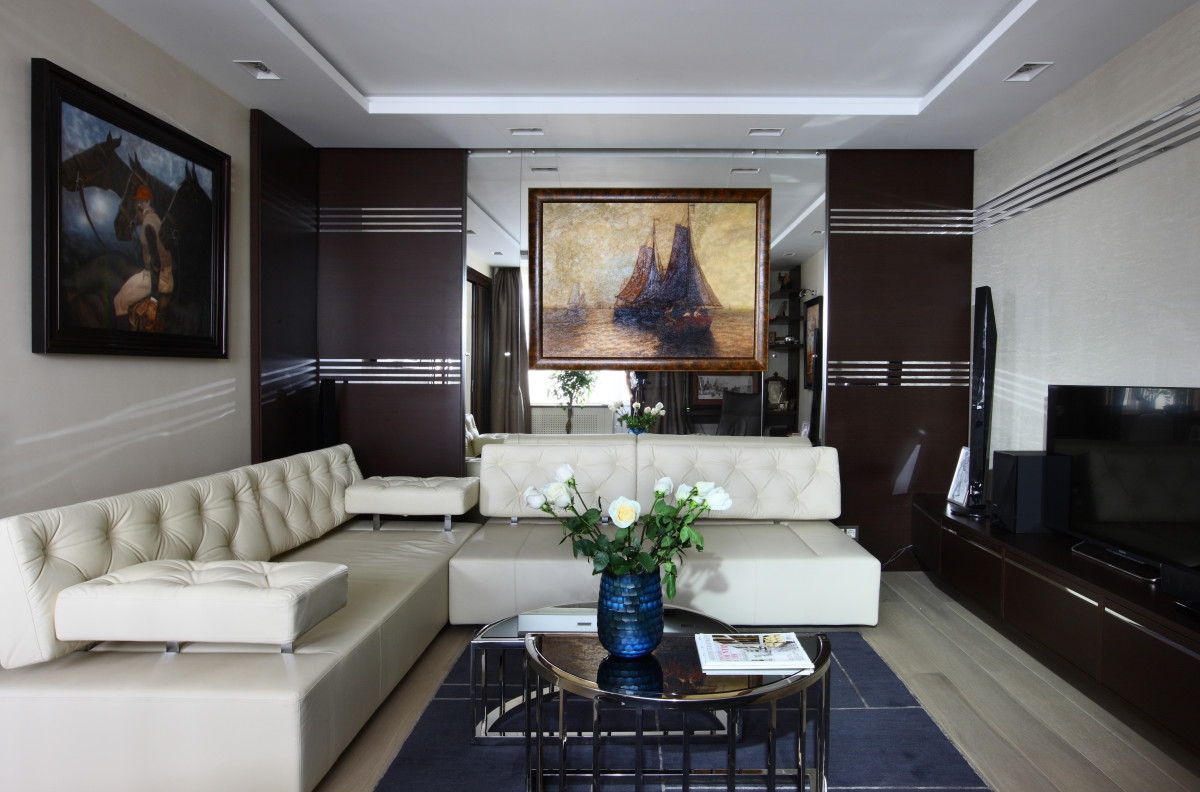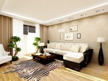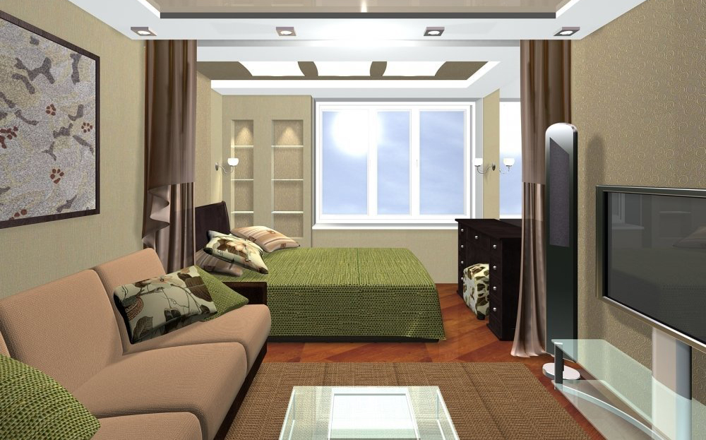 Wenn Sie das Wohnzimmer von einer kleinen Größe machen, können Sie eine feste weiße Decke verwenden. Die Wände sollten etwas dunkler (beige, hellbraun) sein. Bodenbelag geeignet, um in hellen Farben durchzuführen.