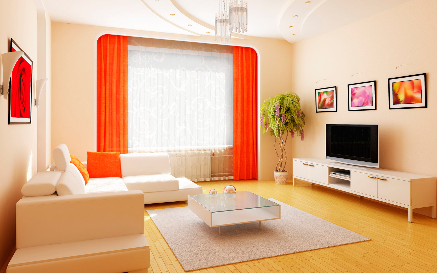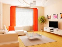 Das Sofa sollte hellrosa oder hellorange sein. Dieses Möbelstück passt perfekt in das Design. In der Nähe können Sie einen Tisch mit Glasplatte arrangieren.