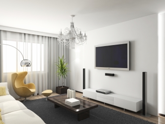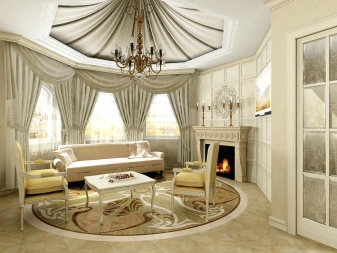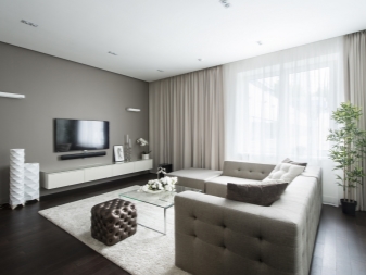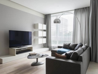 Für die Anordnung des Wohnzimmers in diesem Design benötigen Schlüssel große FensterSonst wird das Innere unvollendet sein. Diese Elemente können nicht von kleinen Wohnungen im "Chruschtschow" rühmen.