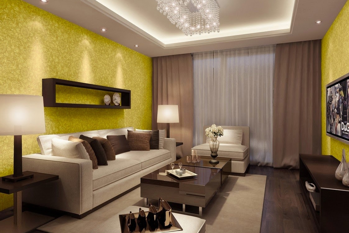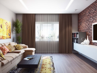 Für kleinere Wohnzimmer sind verschiedene Braun- und Grüntöne geeignet., die die Decke und die Wände beenden können.Es ist besser, den Boden in einem helleren Ton (Rot, Senf) zu machen. Vorhänge passen zu dunkler Schokoladenfarbe. Sie werden dem Interieur Eleganz und Raffinesse verleihen können.