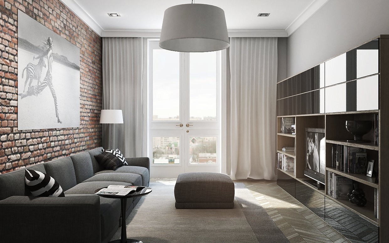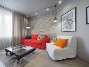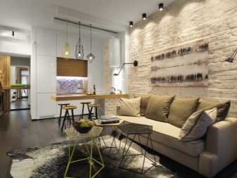 Diese Art von Arrangement ist modisch und originell. Trotz der Tatsache, dass dieser Stil große Räume liebt, kann es leicht in einem kleinen Quadrat erstellt werden. Die Wandbeläge bleiben in der Regel in Form von Mauerwerk erhalten. Für die Decke ist es am besten, eine einfarbige weiße Farbe zu wählen. Der Boden sollte mit Holz verschiedener Sorten getrimmt werden.