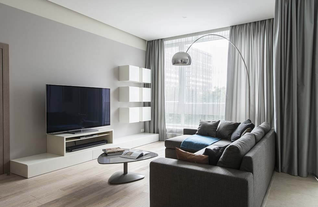 Dies ist eine trendige Designrichtung, die sehr beliebt ist. Die in einem ähnlichen Design gestalteten Innenräume zeichnen sich durch Einfachheit, Harmonie und Multifunktionalität aus. Diese Art der Anordnung zeichnet sich durch geometrische Muster, hohe Decken, Möbel mit matten Beschichtungen aus.
