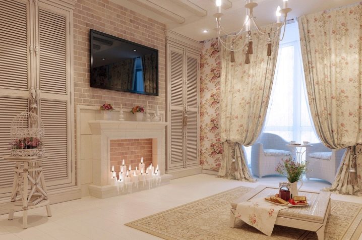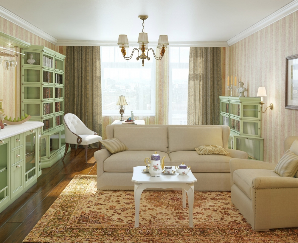 Solch ein Design wird eine elegante und angenehme Einrichtung im Wohnzimmer schaffen. Oft werden in einer ähnlichen Designvariante unterschiedlich dekorierte Möbel aus verschiedenen Holzarten verwendet, Tapeten mit kleinen und unauffälligen Mustern und Formen.In diesem Stil, die Anwesenheit einer kleinen Anzahl von Gemälden, kleinen Vasen, Figuren.