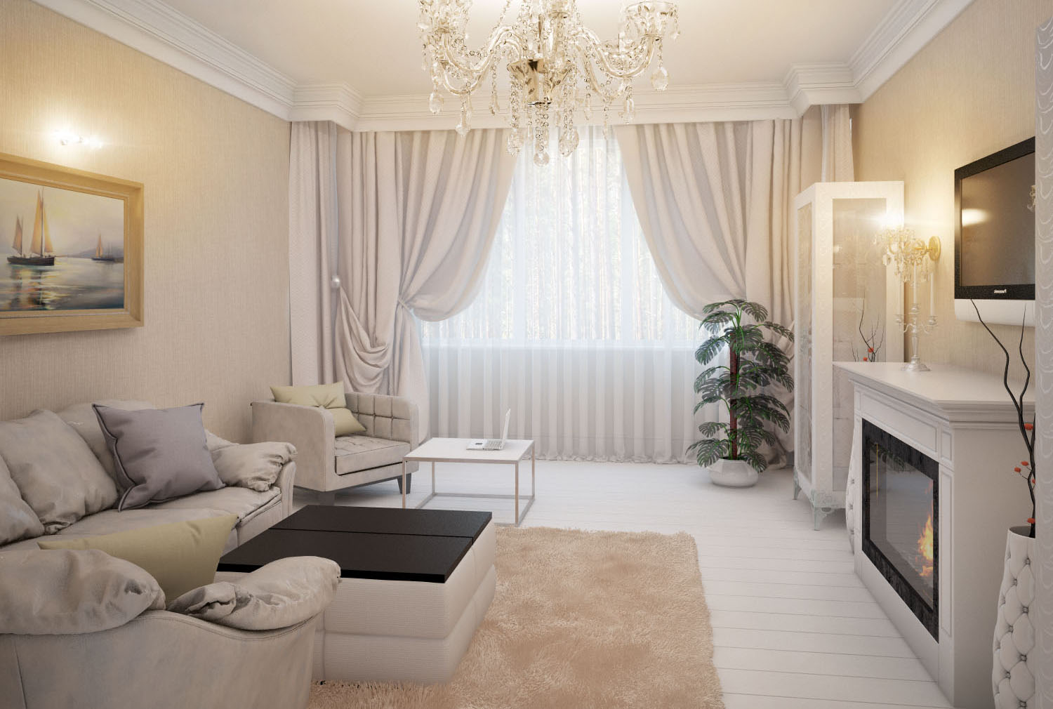 Die Vorhänge verdienen besondere Aufmerksamkeit. Sie spielen eine wichtige Rolle bei der Gestaltung der Halle und anderer Räume. Eine perfekte Wahl wäre ein durchscheinender Schleier mit einem leichten Blumenornament. Es verleiht Ihrem Zimmer die Schönheit und Raffinesse.
