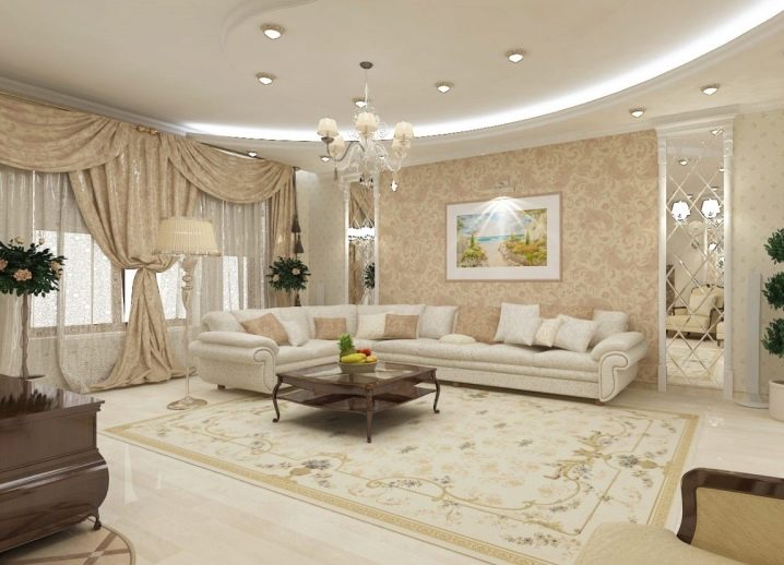 In den klassisch gestalteten Hallen werden oft mehrere Spiegelflächen installiert, die den Wohnbereich optisch erweitern. Auch viele Experten raten mit einer ähnlichen Art von Design, Möbelstücke mit glänzender Satinpolsterung (Sofa, Sessel, Stühle, gepolsterte Hocker) zu verwenden. Traditionell befindet sich ein kleiner Kaffeetisch in der Mitte des Wohnzimmers. Am Rand des Raumes sollten Regale mit Büchern oder Töpfen mit viel Grün platziert werden, die dem Raum eine ungewöhnliche Atmosphäre geben können.