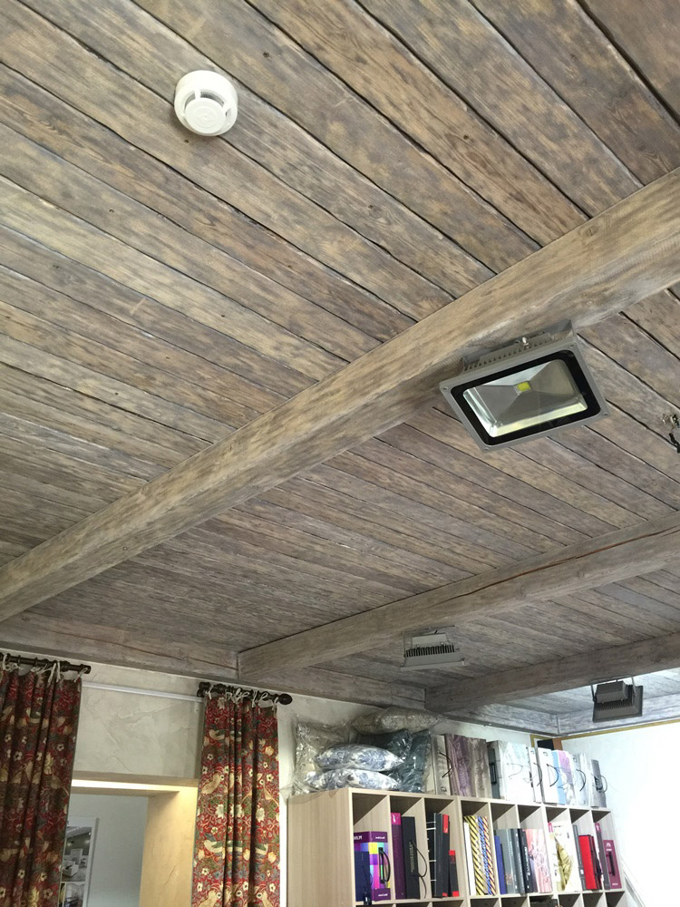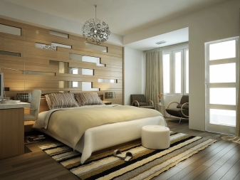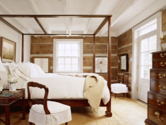 - An der Decke verwendete Holz, Bretter, Fliesen. Bei einigen Designlösungen werden andere Materialien verwendet, beispielsweise wird bei einem Laminat ein Bereich an der Wand am Kopfende des Bettes mit einem glatten Übergang zur Decke markiert. Die geräumigen Zimmer sind mit Holzbalken ausgestattet. Der Höhenverlust im Raum wird 15-20 Zentimeter betragen, aber es gibt auch Pluspunkte: Die Drähte sind leicht hinter den Balken versteckt, die Beleuchtungsvorrichtungen sehen an dieser Decke wunderschön aus.