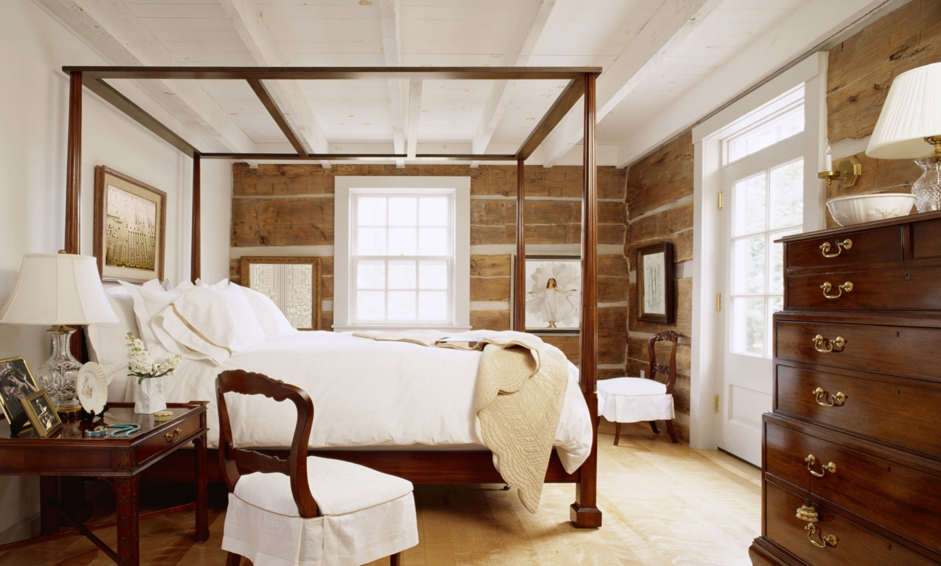 - Im Schlafzimmer kann nicht auf ein gemütliches, warmes Material verzichten. Kopfteil aus Holz, Nachttische, Kommode - ein Klassiker des Genres.