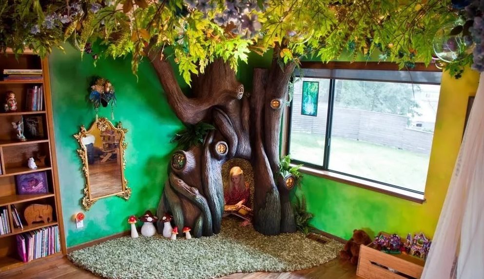 - Für ein Kinderzimmer natürliches, mikroklimaunterstützendes Material wird benötigt. Paneele aus Eichen-, Lärchen- und Holzmöbeln in kräftigen Farben werden reichen.