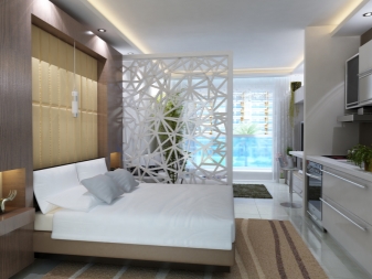 Richtig ausgewählte Möbel gleichen den Raum aus. Der Zweck der Zone kann bestimmt werden, indem das eine oder andere Möbelstück in die Mitte des Raumes gestellt wird. Im zentralen Teil der Küche - ein Ess-Set, im Wohnzimmer - ein Kaffeetisch. Eine gute Lösung für das Erholungsgebiet ist die Lage in der Mitte des Bettes mit hellen Kissen.