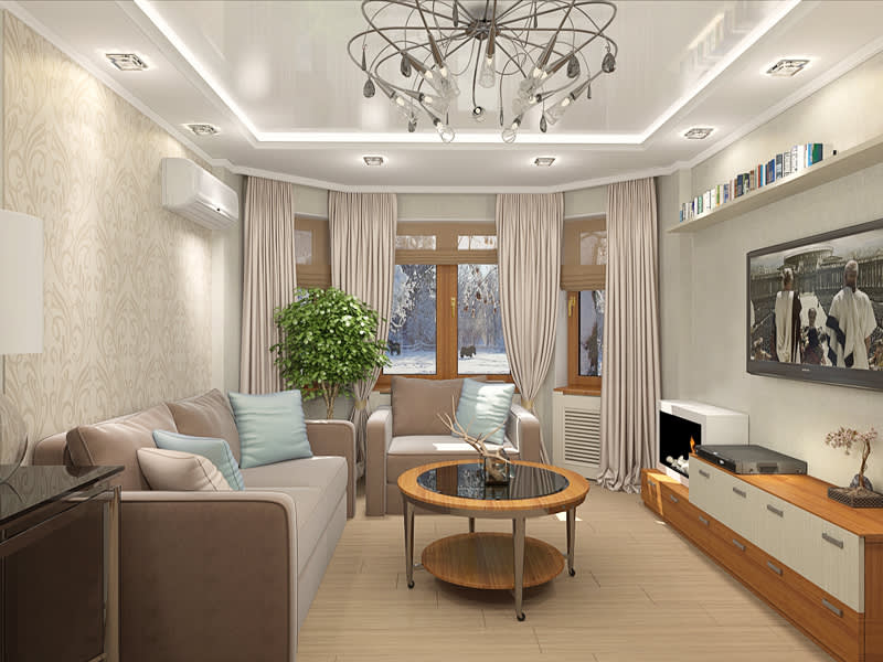 Richtige Beleuchtung kann die Größe des Raumes erheblich vergrößern. Die Ausrichtung des Lichts auf der dunklen Seite wird den Raum geräumiger machen. Eine gute Lösung für eine Wohnung von 70 Quadratmetern. wird eine zweistufige Beleuchtung, die modern und stilvoll aussieht. Neben den Deckenlüstern mit solcher Beleuchtung werden Strahler, Nachttischlampen und Stehlampen verwendet. Eine solche Beleuchtung wird verwendet, um Gemütlichkeit und Komfort zu schaffen.