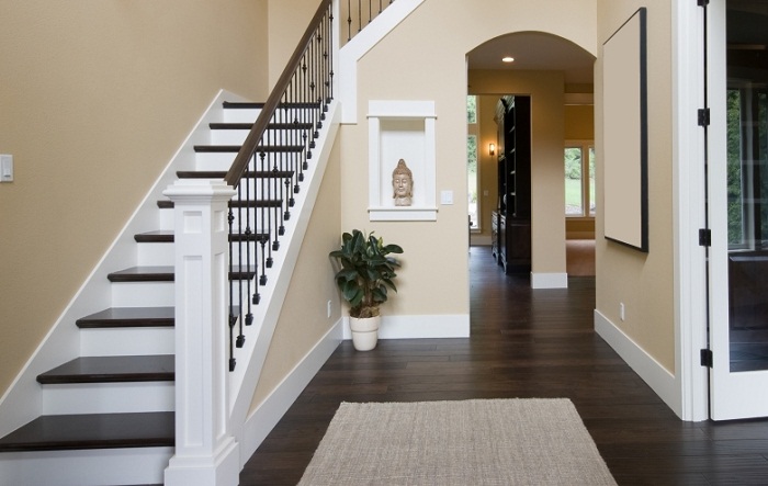 Wie bereits erwähnt, ist die Treppe ein zentrales Element in einem Apartment-Projekt. Daher sollten Sie besonders auf ihre Wahl achten. Zunächst sollte beachtet werden, dass die Breite der Stufen mindestens dreißig Zentimeter und die Höhe ungefähr fünfzehn Zentimeter betragen sollte. In diesem Fall wird die Treppe am bequemsten sein, um hinunterzugehen und zu klettern. Jetzt ist es Zeit, sich für den Stil der Treppe zu entscheiden. Wir listen mehrere Hauptsorten solcher Strukturen auf: