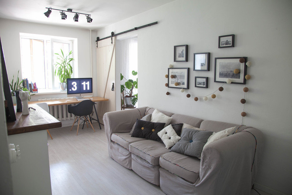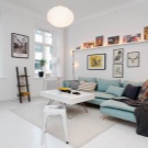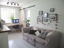 Es gibt nur notwendige Dinge hier, es gibt nichts überflüssiges, es gibt viel natürliches Licht im Raum. Alle Möbel sind einfach, aber gleichzeitig funktional. Der Komfort wird mit Hilfe von Gemälden an der Wand, Regalen, Fotos in Rahmen und einigen Accessoires geschaffen.