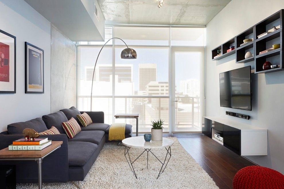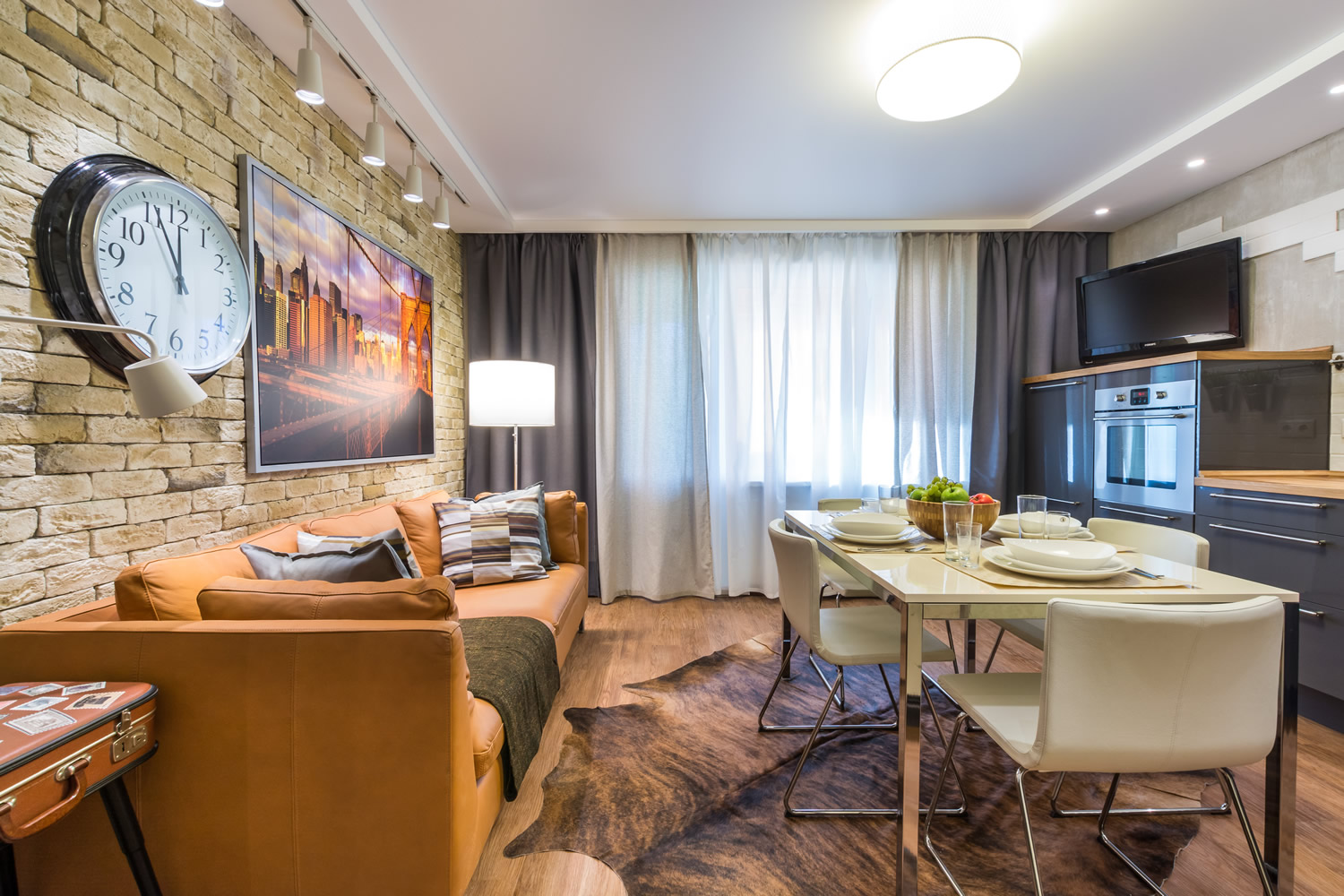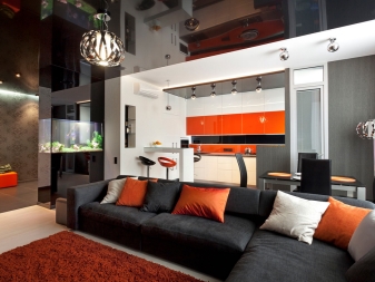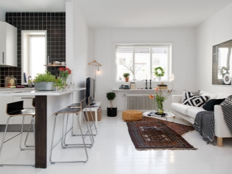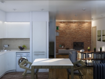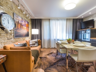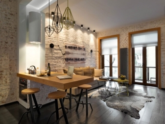 Um eine Wohnung im Stil eines Lofts zu arrangieren, müssen Sie den Raum erweitern, und dies kann durch die Kombination von Räumen erfolgen. Zum Beispiel ist die Küche mit dem Wohnzimmer und der Loggia - mit dem Raum kombiniert.
