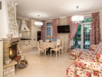 Hier ist die Wohnung, im Stil der Provence eingerichtet. Diese Richtung zeichnet sich durch Pastelltöne, elegante halb-antike Möbel, verschiedene Dekorationen, Textilien und Kunsthandwerk aus. Das Innere des Raumes wird von rosa, weißen und hellgrünen Farben dominiert.Helle Möbel mit anmutigen Rundungen, Kerzen, Stehlampen, Vorhänge, Gemälde an den Wänden - das alles verleiht dem Raum Gemütlichkeit und besonderen Charme. Der Fernseher fällt nicht auf, er ist in der Umgebung fast nicht wahrnehmbar.