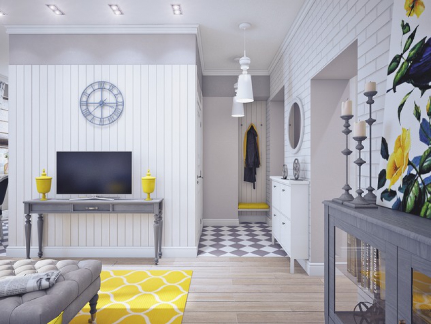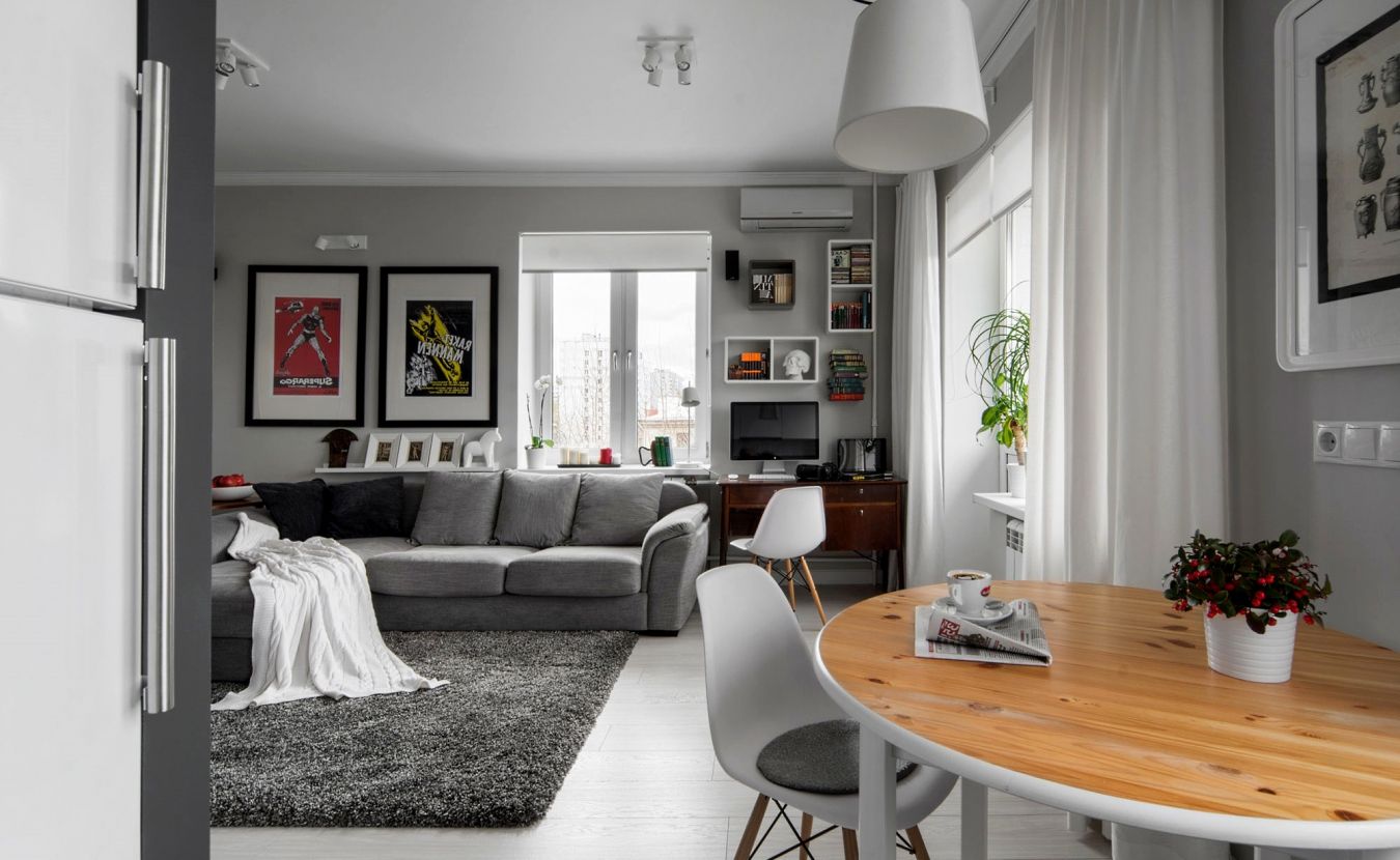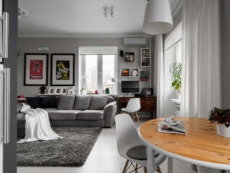 Auf diesen Fotos sehen Sie ein Beispiel des Designs "Chruschtschow" im skandinavischen Stil. Einfachheit und Natürlichkeit, Fülle von Licht und Leichtigkeit zeichnen diesen Stil aus. Das Innere der Wohnung wird von zwei Farben dominiert - weiß und grau. Weiße Wände, Decke, Vorhänge kontrastieren mit grauen Möbeln und Teppichen.