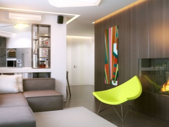 "Chruschtschow" im Stil von Hi-Tech. Die Technik nimmt einen dominierenden Platz ein, sie konzentriert sich. Die Fülle an Spiegelflächen, kalte Metallic-Töne, künstliches Licht, funktionale Möbel, die Malerei an der Wand mit dem Bild der Stadt - all dies schafft die notwendige Atmosphäre von Modernität und Stil in der Wohnung.