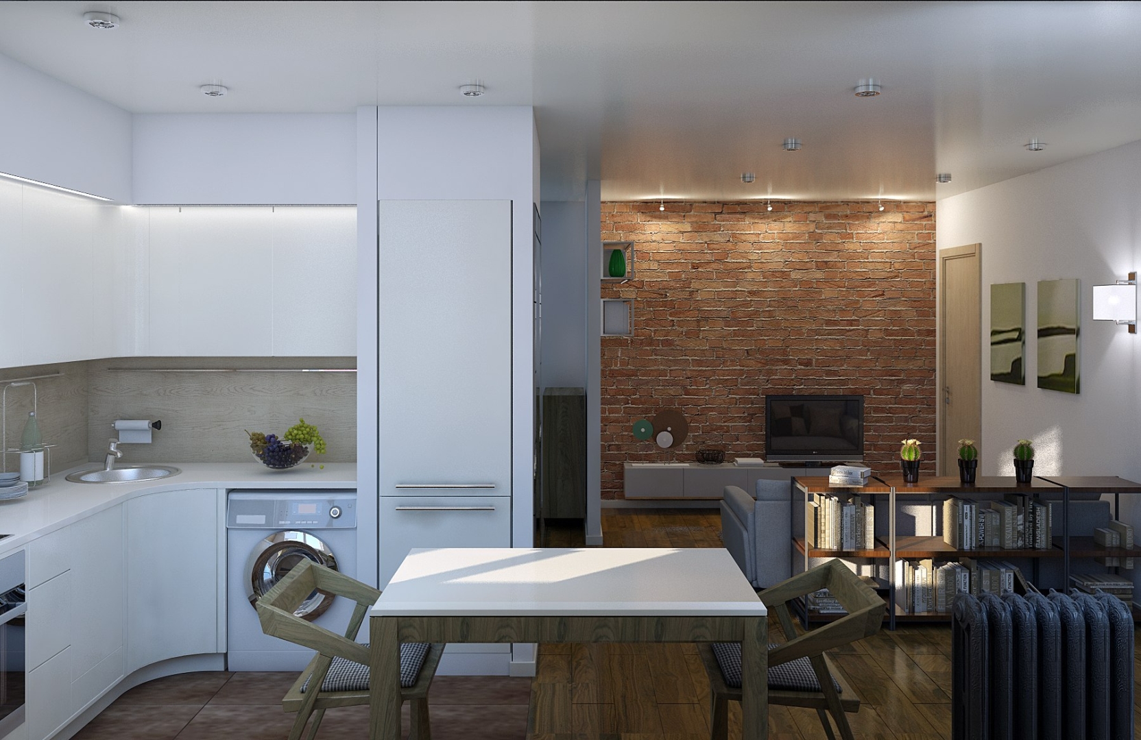 Hier ist eine Wohnung im Loft-Stil. Backsteinmauern ohne Dekoration, das Gefühl einer gewissen Verlassenheit und Unvollendetheit, aber gleichzeitig auch die Rücksichtnahme auf die Situation - das alles schafft die richtige Atmosphäre. Die Neugestaltung und Kombination von angrenzenden Räumen schafft ein Gefühl der Großzügigkeit.