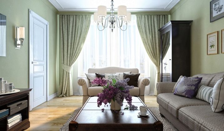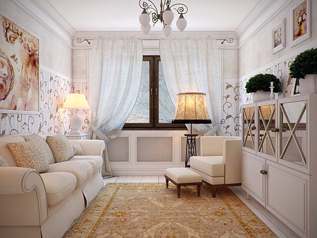 In diesem Foto können Sie den "Chruschtschow" im klassischen Stil sehen. Die Atmosphäre der Aristokratie wird mit Hilfe verschiedener Einrichtungsdetails geschaffen: die reiche Dekoration des Raumes, antike Möbel aus Edelholz, ein Kristallleuchter, Spiegel, Vergoldungen, Antiquitäten, Stuck an der Decke, teure Vorhänge. Der Raum ist eingerahmt von hellen, edlen, aber gleichzeitig unauffälligen und farblich aufeinander abgestimmten Farbtönen.