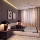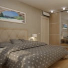 Bereich 12-14 Quadratmeter angenommen für Schlafzimmer und Wohnzimmer. In der Lounge finden Sie ein Doppelbett, ein Nachttischchen, einen Kleiderschrank und eine Kommode. Es ist besser, den Schrank mit Spiegeltüren zu wählen. Sie fügen visuell Volumen hinzu und belegen im offenen Zustand keinen Platz.