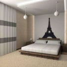 Die Töne der Wände sind besser, um Licht und Ruhe zu wählen. Um ein Element der Helligkeit und Einzigartigkeit zu machen, schmücken Sie die Wand hinter dem Kopfteil mit Tapeten mit einem großen Ornament oder Fotowand.