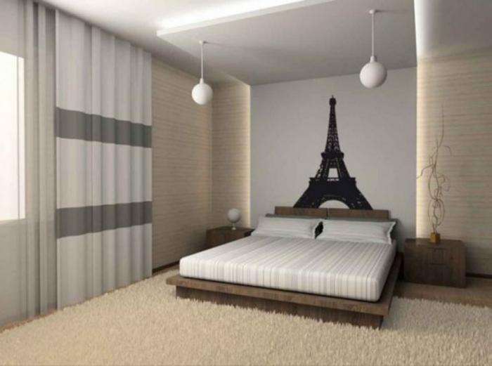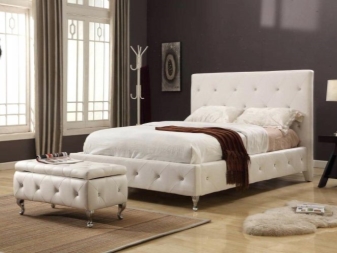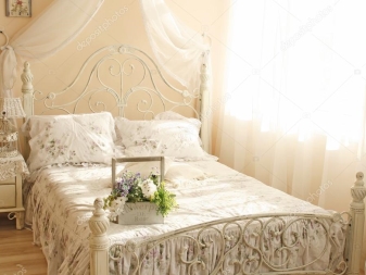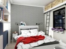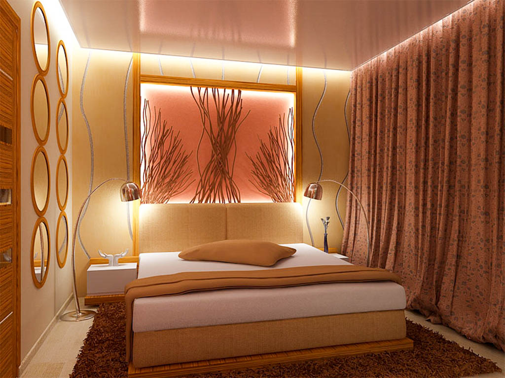 Der zentrale Platz nimmt das Bett. Der Rest der Möbel und des Dekors wird um ihn herum angeordnet sein. In kleinen Schlafzimmern sollte auf die Installation massiver Schränke verzichtet werden. Wählen Sie Vorhänge und weiche Stoffbezüge, um Komfort und Gemütlichkeit zu schaffen. Eine ausgezeichnete Lösung wäre ein weicher Teppich mit einem unauffälligen Muster.