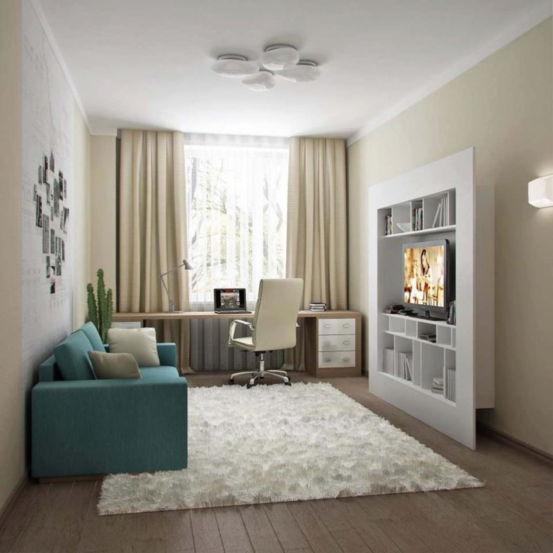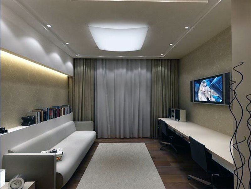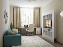 In den Zimmern 3,5 x 5 m Sie können ein Erholungsgebiet und eine Studie platzieren. Ein Bücherregal und ein Computertisch passen in eine Ecke des Raumes. Und die Isolierung des Arbeitsraumes kann durch strenge Lampen betont werden. Das Sofa in solch einem Wohnzimmer ist besser, die klassische strenge Form, ohne komplizierte Details zu wählen. In den Farbtönen ist es besser, weiße, beige, Pastelltöne zu bevorzugen.Sie werden den Raum erweitern und Licht hinzufügen.