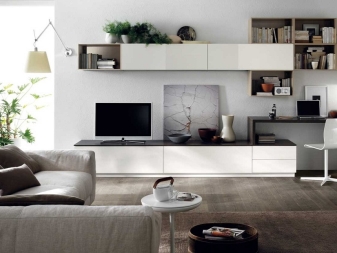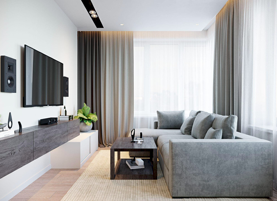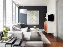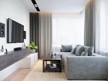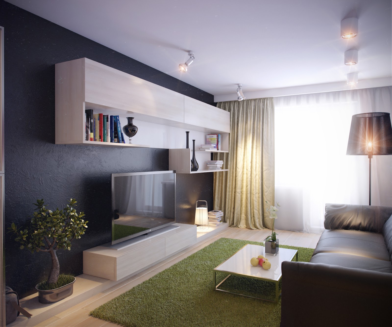In dem kleinen Wohnzimmer können Sie ein Sofa, eine kleine Wand und einen Computertisch platzieren. Neben der Wand sollten Sie auf die TV-Schränke oder kleine Strukturen aus Spanplatten oder Gipskartonplatten achten, um den Raum nicht zu überlasten.